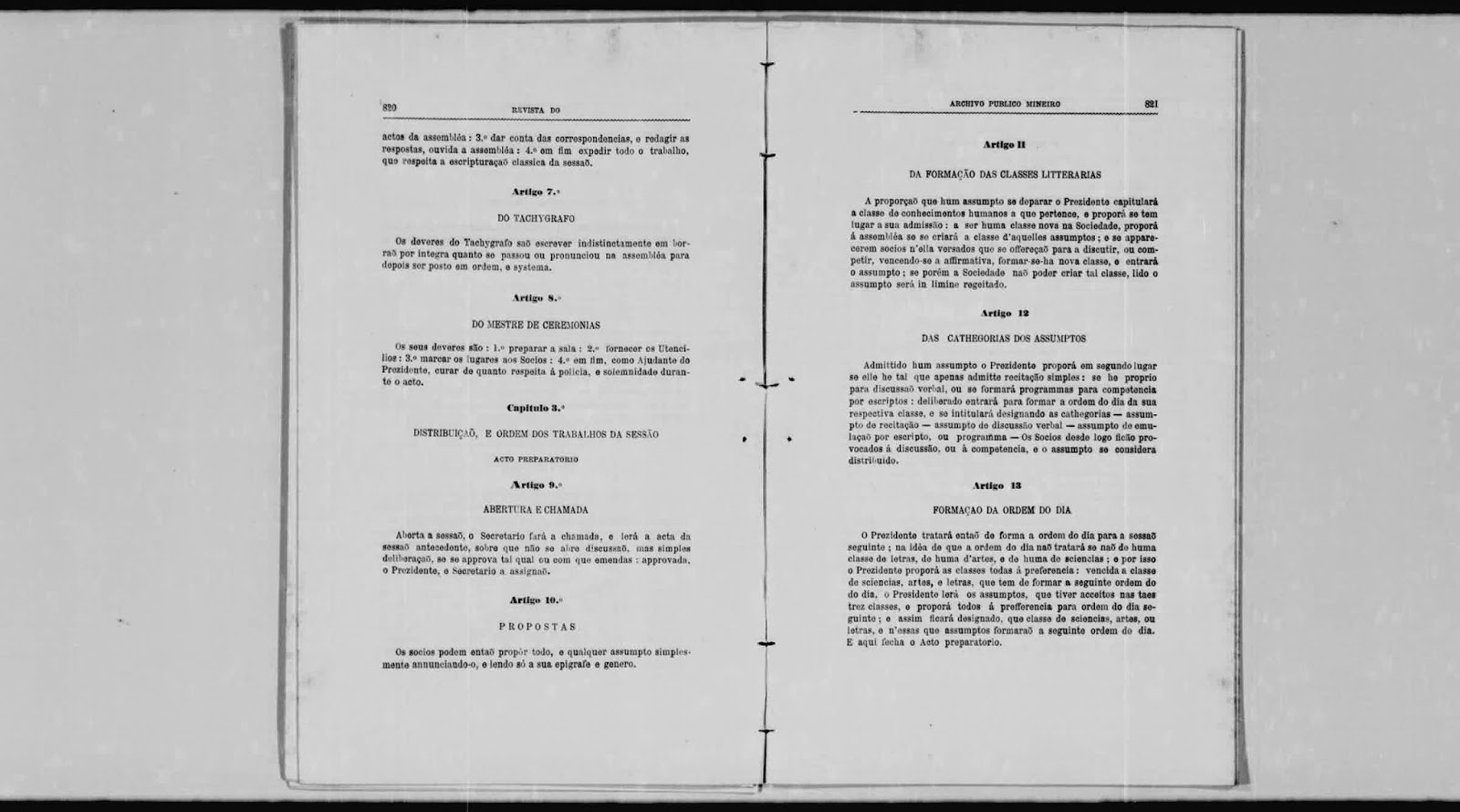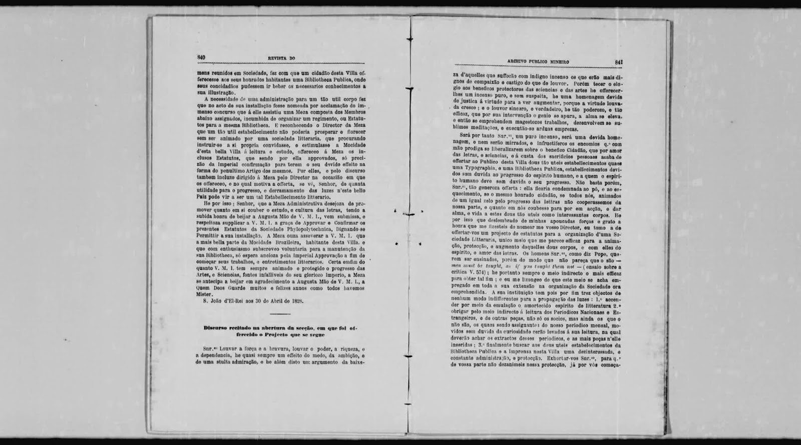 "Em observancia da Portaria desta Secretaria de Estado dos Negocios do Imperio, em data de 5 do Corrente, li os Estatutos, offerecidos em Projecto, pelo Juiz de Fora da Villa de S. João d'El-Rey, para huma Sociedade Philopolytechica, que se propõe estabelecer na mesma Villa, na Casa da Bibliotheca Publica, alli proximamente erecta, para o seu auxilio, pertendendo a Approvação e Sancção Imperial. Declara-se que a Sociedade será de Sciencias, Artes, e Letras, com tres Repartições, de Gymnasio — Gabinete de Estudos, — e Directoria.