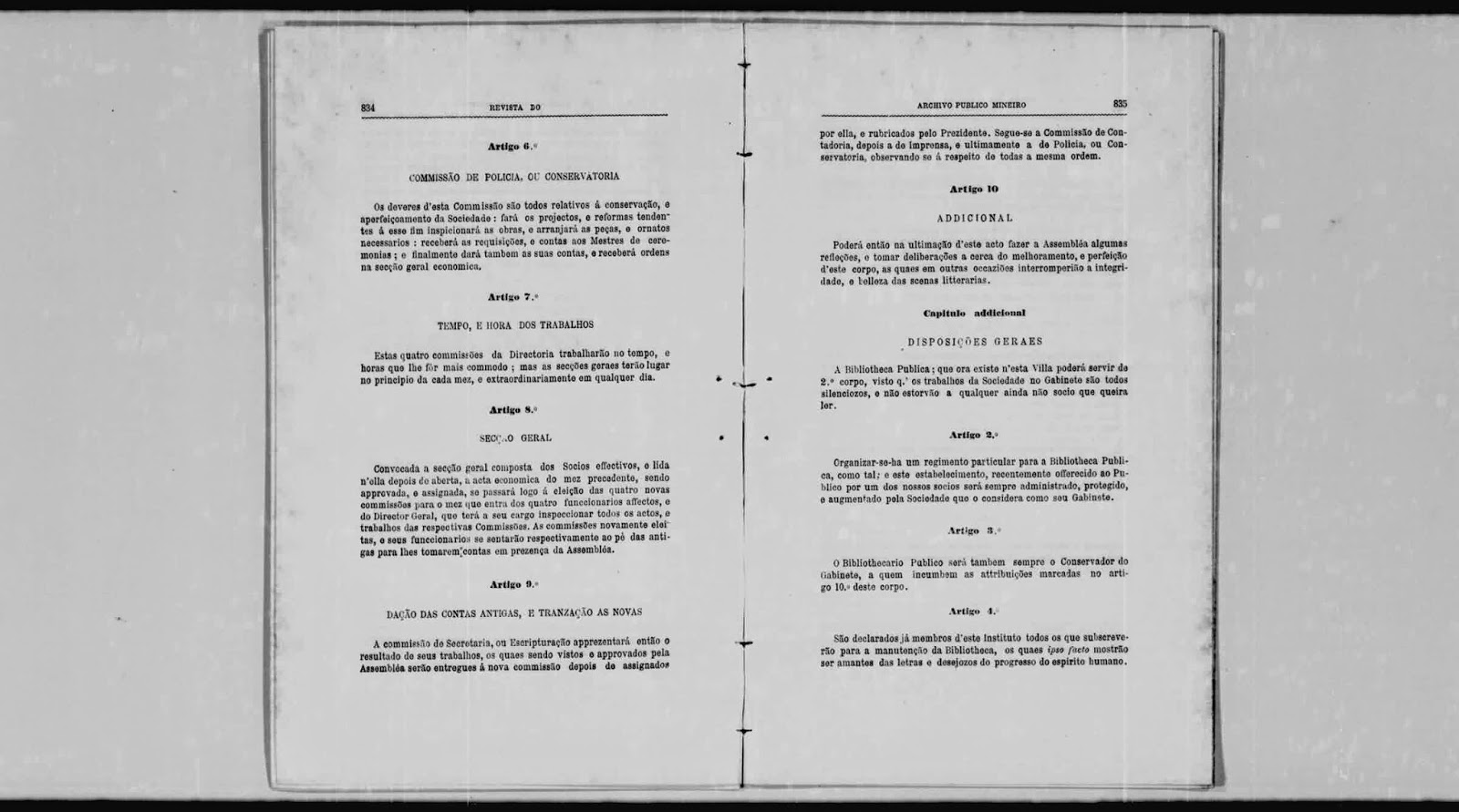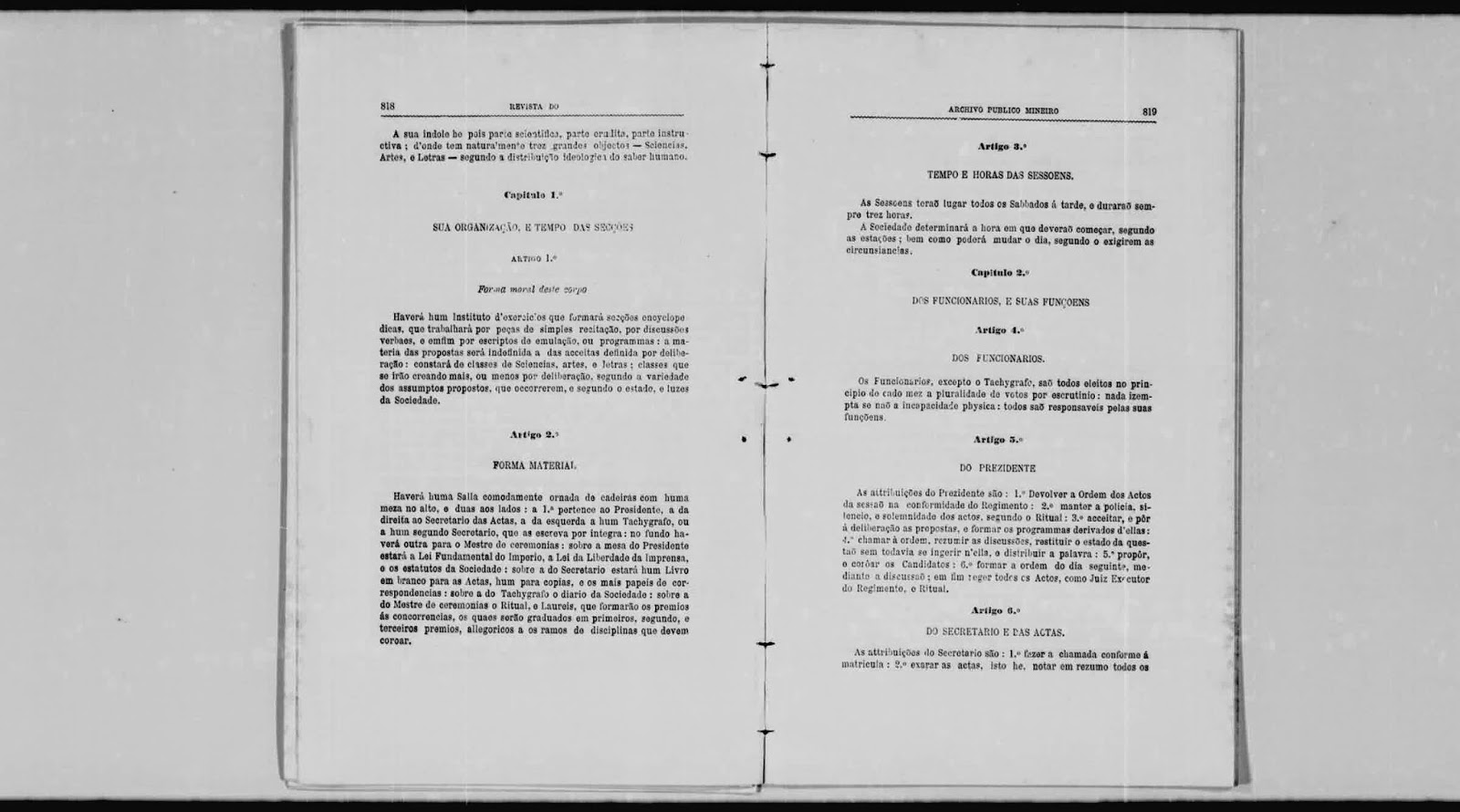 As Leis sociaes, e religiozas são a unica coacção externa, a pluralidade de suffragios da Assembléa a unica coacção interna, que marca os limites d'esta liberdade. Não será admittida de pessôa, ou corpo algum extrinseco, se não coadjuvante, e indirecta. Esta sociedade he igual, isto he todos os socios terão iguaes direitos, e deveres essencialmente, e só accidental, e temporariamente estes podem accumular-se por delegação spontanêa nos funcionarios, que serão ellegiveis, e amoviveis por seu turno: todos os Socios pois concorrem à celebração de seus actos, e sessõens e à administração de suas economias; e todos vice-versa tem o cargo respectivamente todos os onus e deveres da Sociedade. A sociedade consta de trez corpos, ou Institutos, e suas respectivas commissõens, e funcionarios — 1º Hum Instituto de Exercicio de Doutrina, e palavra com o fim de aperfeiçoar nossas faculdades pela deliberação, e pelo conflicto das Luzes em todos os assmptos dos conhecimentos humanos; o qual como theatro d'ensaios, e exercicios poderá intitular-se — Gymnasio Litterario — 2º Hum Instituto estudioso, a fim de nos enriquecer, e pôr ao nivel das luzes da Europa culta pela leitura das peças periodicas de varias Nações, e de repartir este thezouro com nossos Compatriotas por huma folha d'extractos por nós redegida: este corpo por intitular-se — Gabinete d'Estudos — 3º Hum Instituto economico, que pela ordem das coizas deve fazer sempre huma parte integrante de todas as Sociedades, que involvem e suppoem especies de administração, execução, economia, e policia: este Instituto, mais administrativo que litterario, e que encorpóra em si muitos elementos, que interpolados aos outros dous, cortarião a sua belleza, e integridade, pode intitular-se — Directoria —"