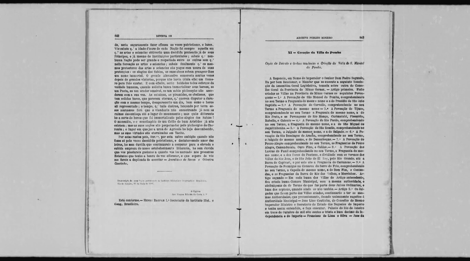 "Illmº. e Exmº. Senr.O nosso prestimoso consocio e digno terceiro Vice-Presidente desta asssociação na busca rigorosa que deo na organização do Archivo da Secretaria de Estado dos Negocios do Imperio, confiado ao seo zello e cuidado, encontrou curiosos e importantes documentos que dão muita luz à historia e geographia patria; teve o nosso collega a bondade de mostrar-me estes documentos, que são realmente muito valiosos, e não tendo tido tempo para extrahir copias de todos elles a fim de offerecel-os ao Instituto Historico, comecei por tirar a do projecto da Sociedade Philopolytechica, emprehendida em S. João de ElRey na Provincia de Minas Geraes sob os Principios do fallecido Visconde de Sepetiba, quando ali servio como Juiz de Fora em 1828.