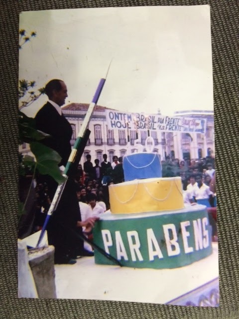 | Djalma Assis sobre um palanque no Carnaval. Lê-se na faixa: Ontem Brasil para frente, hoje Brasil na frente |