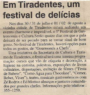 Na edição número 1 do jornal Gazeta de São João del Rei, veiculada dia 18 de julho de 1998, a equipe de jornalismo abordou as festas de Coronel Xavier Chaves, Tiradentes, Resende Costa, Carrancas e Entre Rios de Minas. Na semana passada, as exposições de Ritápolis e Coronel Xavier Chaves ocuparam a página 5 da Gazeta.