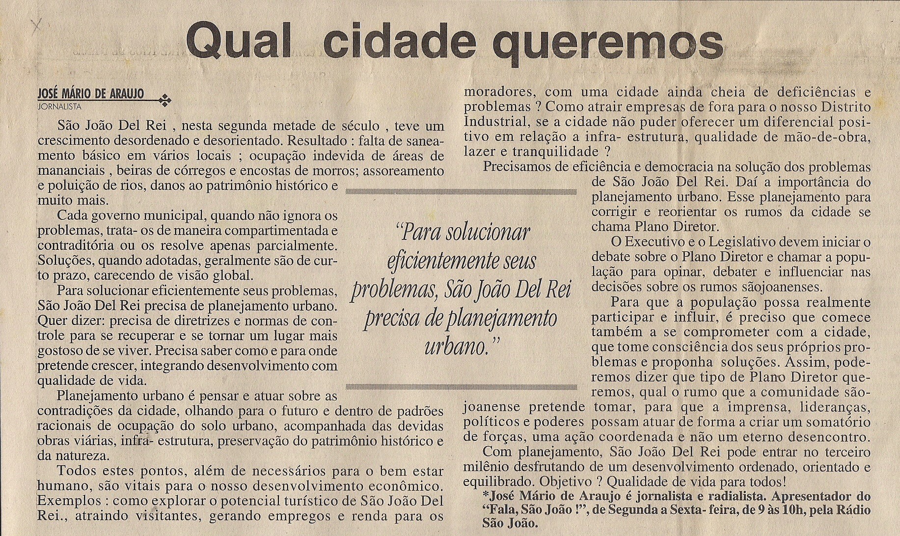 Para solucionar eficientemente seus problemas, São João del-Rei precisa de planejamento urbano. Quer dizer: precisa de diretrizes e normas de controle para se recuperar e se tornar um lugar mais gostoso de se viver. Precisa saber como e para onde pretende crescer, integrando desenvolvimento com qualidade de vida.