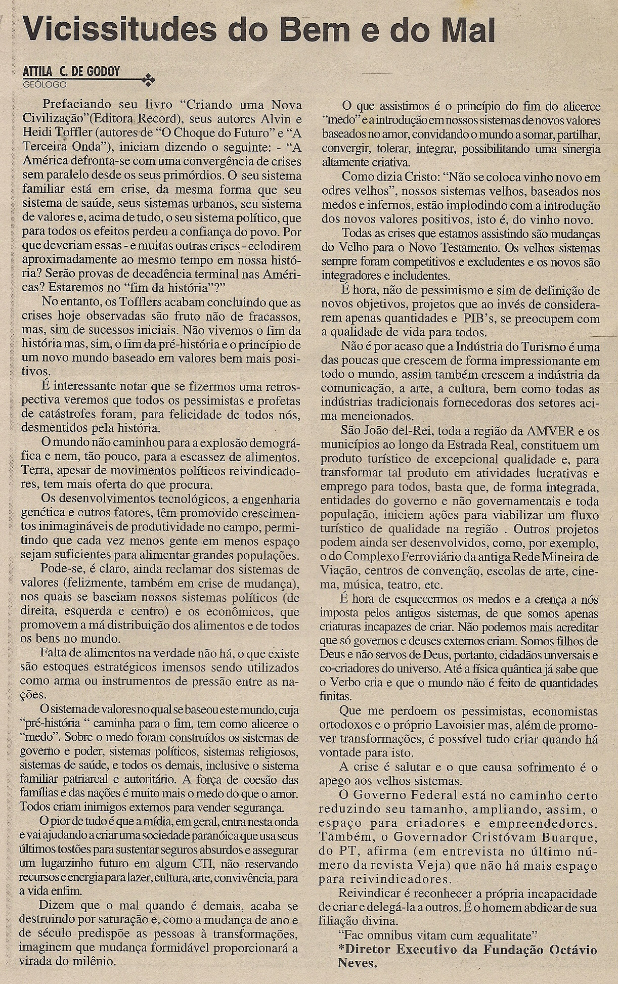 Prefaciando seu livro “Criando uma Nova Civilização” (editora Record), seus autores Alvin e Heidi Toffler (autores de “O Choque do Futuro” e “A Terceira onda”), iniciam dizendo o seguinte: - “A América defronta-se com uma convergência de crises sem paralelo desde os seus primórdios. O seu sistema familiar está em crise, da mesma forma que seu sistema de saúde, seus sistemas urbanos, seu sistema de valores e, acima de tudo, o seu sistema político, que para todos os efeitos perdeu a confiança do povo. Por que deveriam essas – e muitas outras crises – eclodirem aproximadamente ao mesmo tempo em nossa história? Serão provas de decadência terminal nas Américas? Estaremos no “fim da história”?”.
