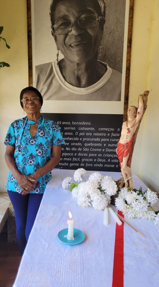Esta é a benzedeira Dona Erci, com sua religiosidade e senso de humanidade, tornou-se a musa dos artistas: fotógrafos, pintores, gratifeiros, poetas e contistas. Figura generosa e detentora de uma memória singular, de muitas alegrias - mas também de dor, pela descendência direta dos escravizados. Para sobreviver por certo tempo trabalhou como garimpeira e com os lucros da bateia conseguiu criar sua família.