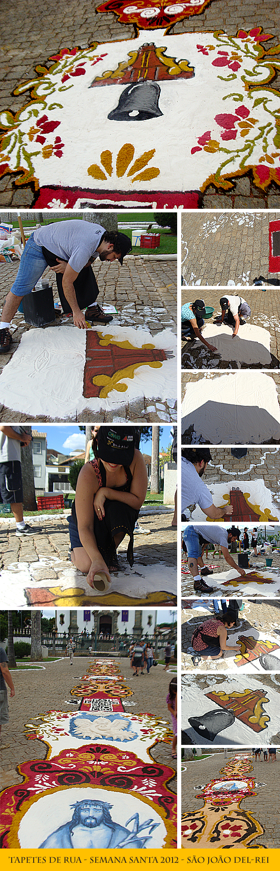 Este ano, a Semana Santa em São João del-Rei foi marcada mais uma vez por um atrativo que há anos encanta os sanjoanenses. Coloridos e emocionantes, os tapetes de rua atraíram muitos turistas e moradores da cidade. Montados na quinta-feira, dia 04, e na sexta-feira santa, os tapetes no largo do São Francisco foram organizados e confeccionados pelo grupo Atitude Cultural (projeto que realiza inúmeros eventos sócio-culturais e pesquisas junto à comunidade e região), juntamente com a participação de crianças, da comunidade e de artistas locais.