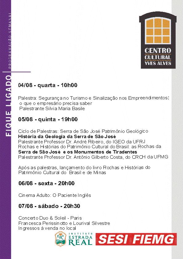 Palestras, Cinema e Concerto . Centro Cultural Yves Alves . 04 a 07 de agosto