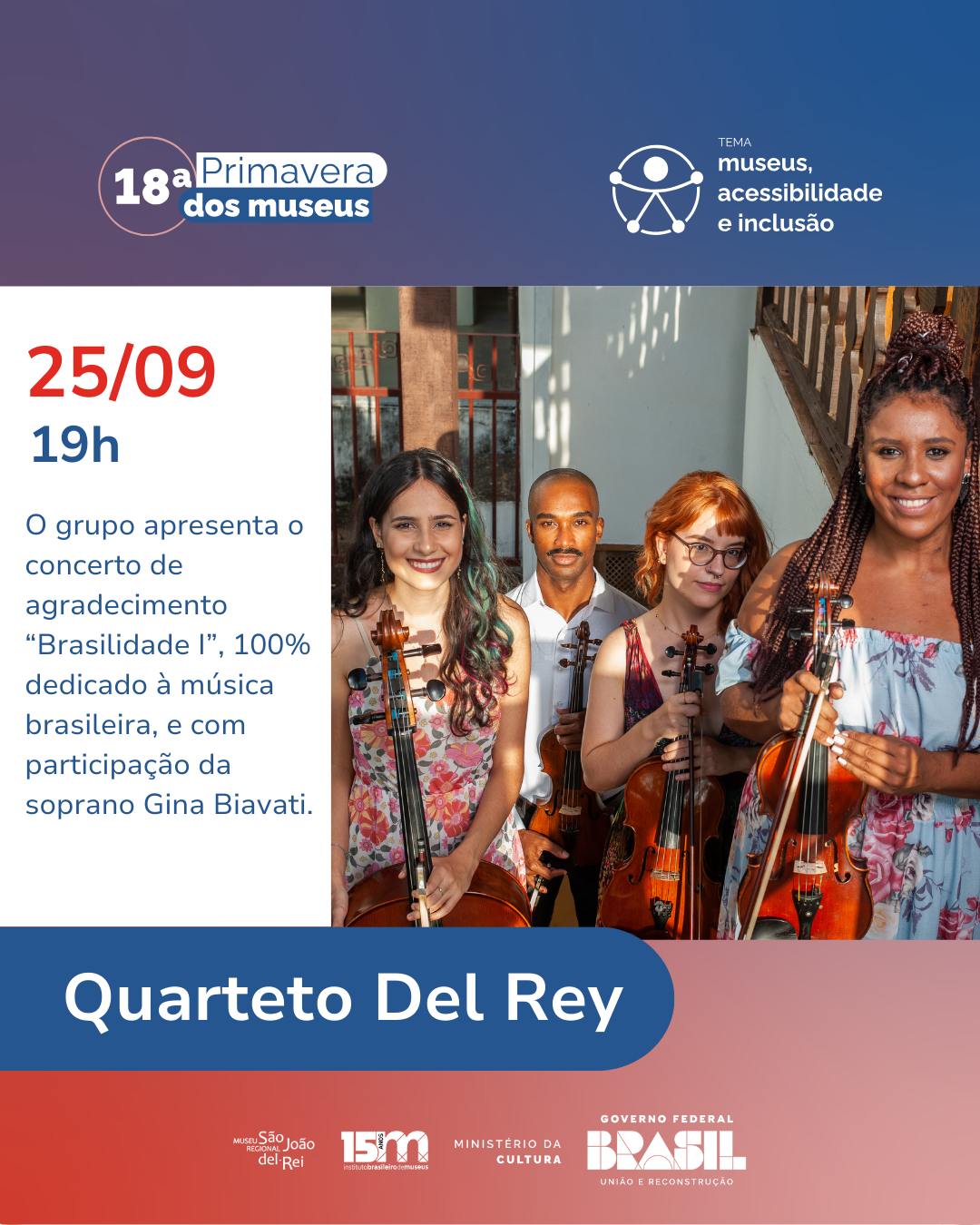 Na quarta feira, dia 25 de Setembro, acontece o Concerto "Brasilidades I" realizado pelo Quarteto Del Rey. O repertório contará com música 100% brasileira, e terá a participação especial da soprano Gina Biavati.
