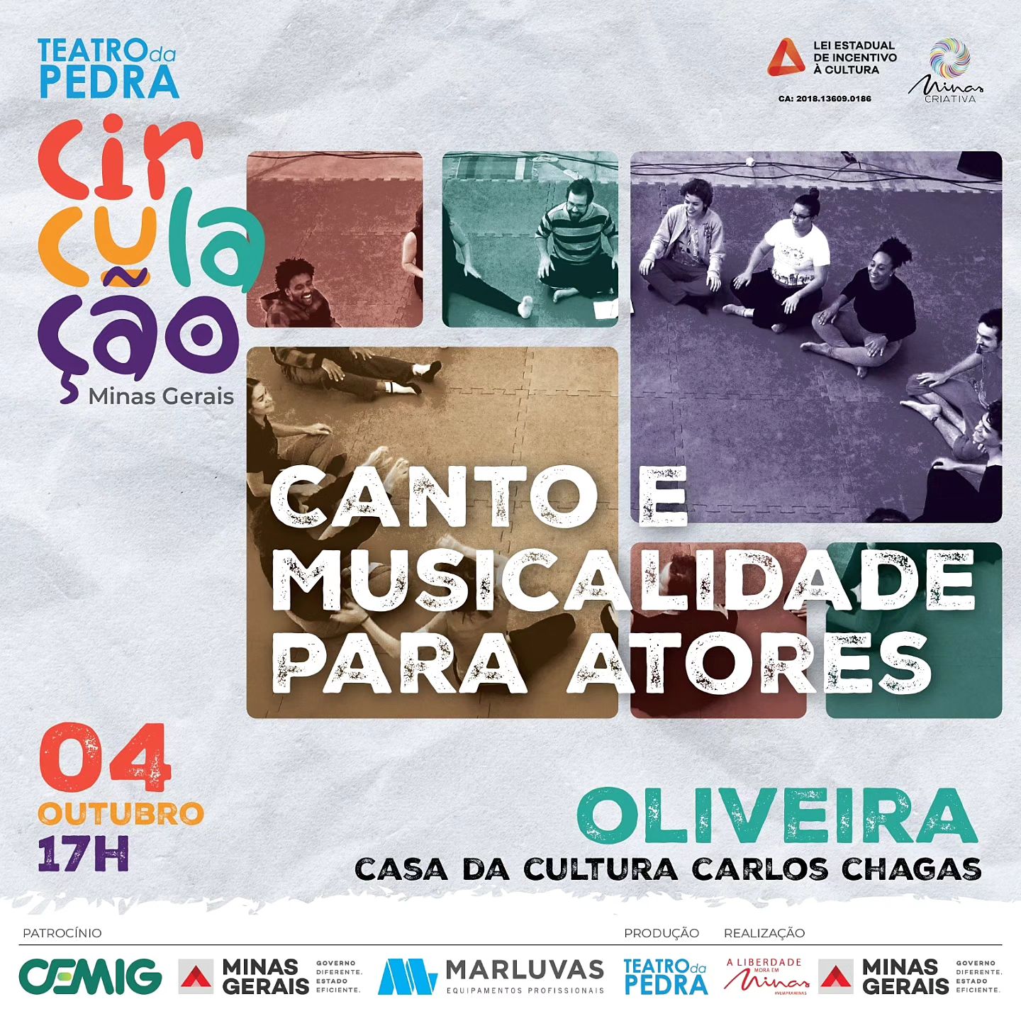 Nesta sexta feira dia 04 de Outubro, o Teatro da Pedra oferece a oficina de Canto e Musicalidade para Atores. A oficina faz parte do projeto Circulação, que levará o Teatro da Pedra à 9 cidades mineiras diferentes. O projeto é apoiado pela Lei Estadual de Incentivo à Cultura, com patrocínio da CEMIG e Marluvas, e produção do Teatro da Pedra. A realização é do Governo de Minas.