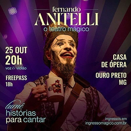 No dia 25 de outubro, a Casa da Ópera de Ouro Preto receberá Fernando Anitelli, fundador e líder do Teatro Mágico, para a apresentação da turnê "Histórias para Cantar", que celebra os 20 anos de trajetória da banda. O evento incluirá uma seleção de músicas que marcaram a carreira do grupo, conhecido pela fusão de música, poesia e elementos teatrais.