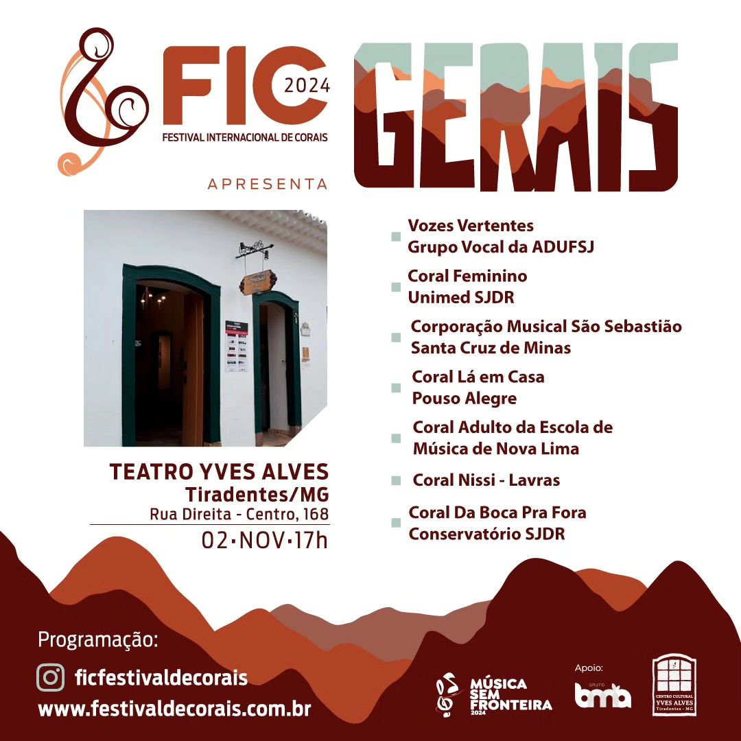 Neste sábado, 2 de novembro, a partir das 17h, o Centro Cultural Yves Alves receberá o Festival Internacional de Corais (FIC). O evento contará com a participação de diversos grupos, incluindo o Vozes Vertentes (Grupo Vocal da ADUFDJ), o Coral Feminino (Unimed SJDR), a Corporação Musical São Sebastião (Santa Cruz de Minas), o Coral Lá em Casa (Pouso Alegre), o Coral Adulto da Escola de Música de Nova Lima, o Coral Nissi (Lavras) e o Coral Da Boca Pra Fora (Conservatório SJDR).