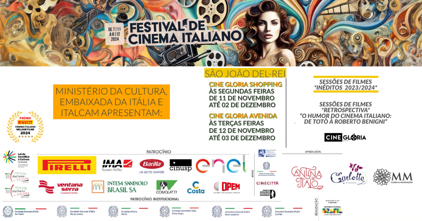A 19ª edição do Festival de Cinema Italiano no Brasil ocorrerá de 7 de novembro a 8 de dezembro de 2024, em formato híbrido, com exibições presenciais em todo o país e online por meio de uma plataforma de streaming geobloqueada. Todas as exibições são gratuitas, permitindo que o cinema italiano chegue a localidades sem salas de cinema.