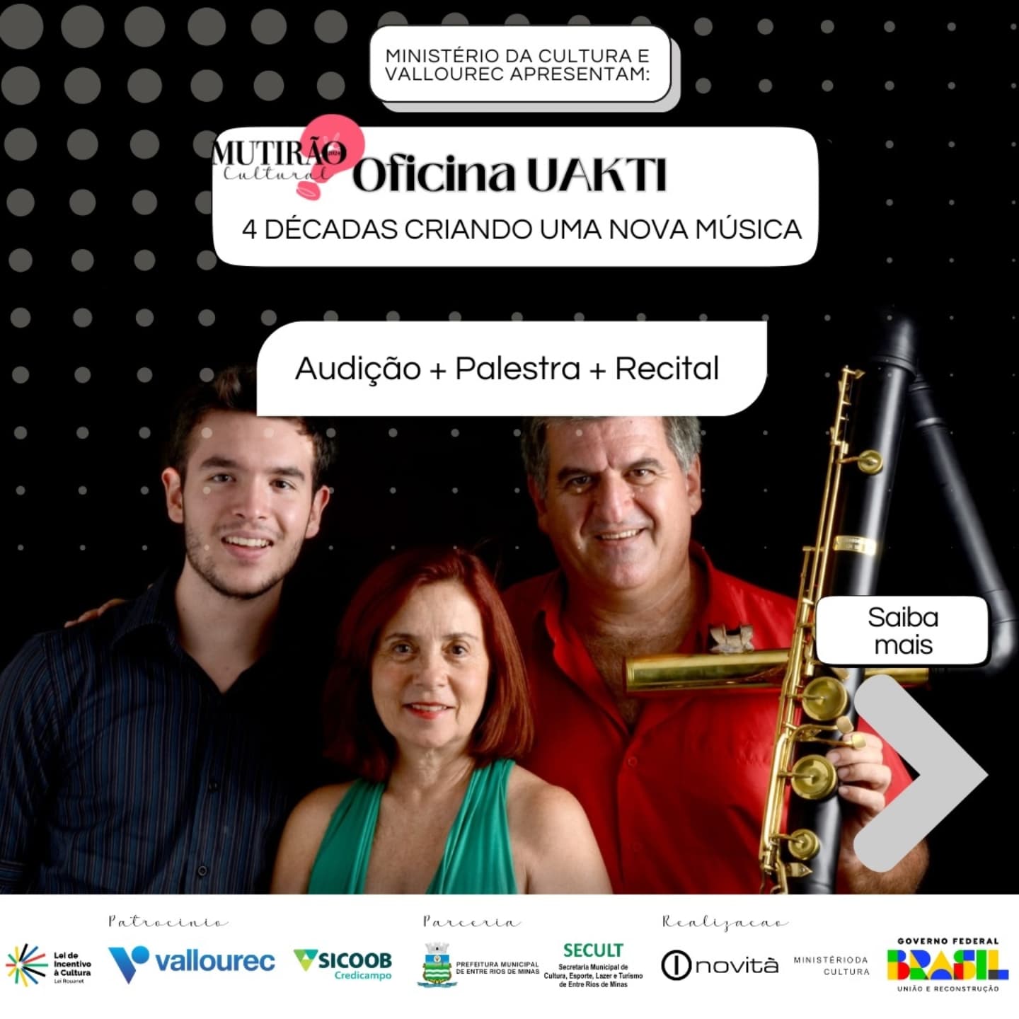 No dia 02 de novembro, será realizada uma oficina gratuita sobre a história e a música do grupo icônico Uakti, sob a orientação de Artur Andrés. O evento ocorrerá das 14h às 18h no Estúdio Macieiras. Haverá uma van gratuita para 15 pessoas, com saída da Praça Cel. Joaquim Resende, 126 - Padaria Saiôla. As vagas são limitadas a 30 pessoas.