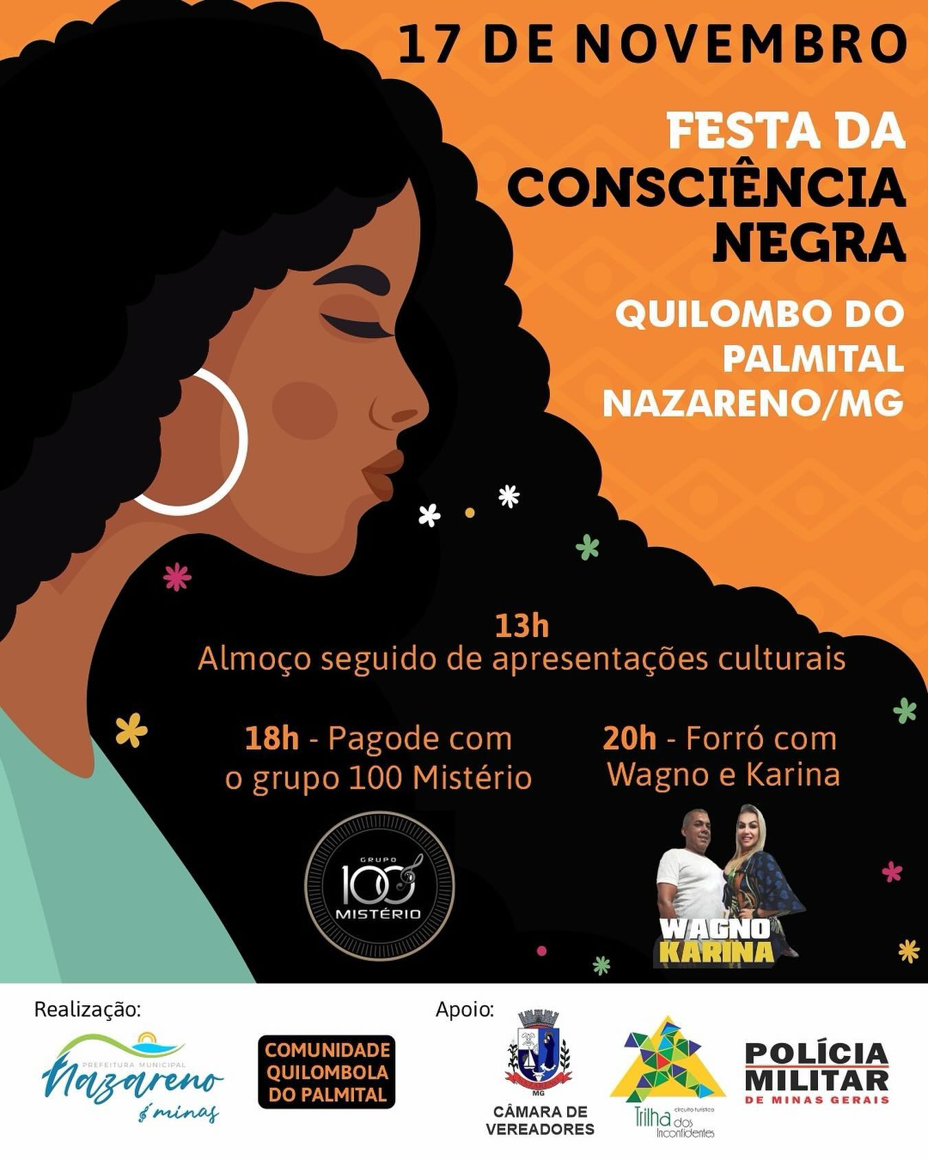 O evento segue com apresentações musicais: às 18h, o grupo 100 Mistério traz o pagode, e, às 20h, Wagno Karina encerra a noite com um animado forró. A festa é uma realização da Prefeitura Municipal de Nazareno em parceria com a Comunidade Quilombola do Palmital e conta com o apoio da Câmara de Vereadores, da Trilha dos Inconfidentes e da Polícia Militar de Minas Gerais.