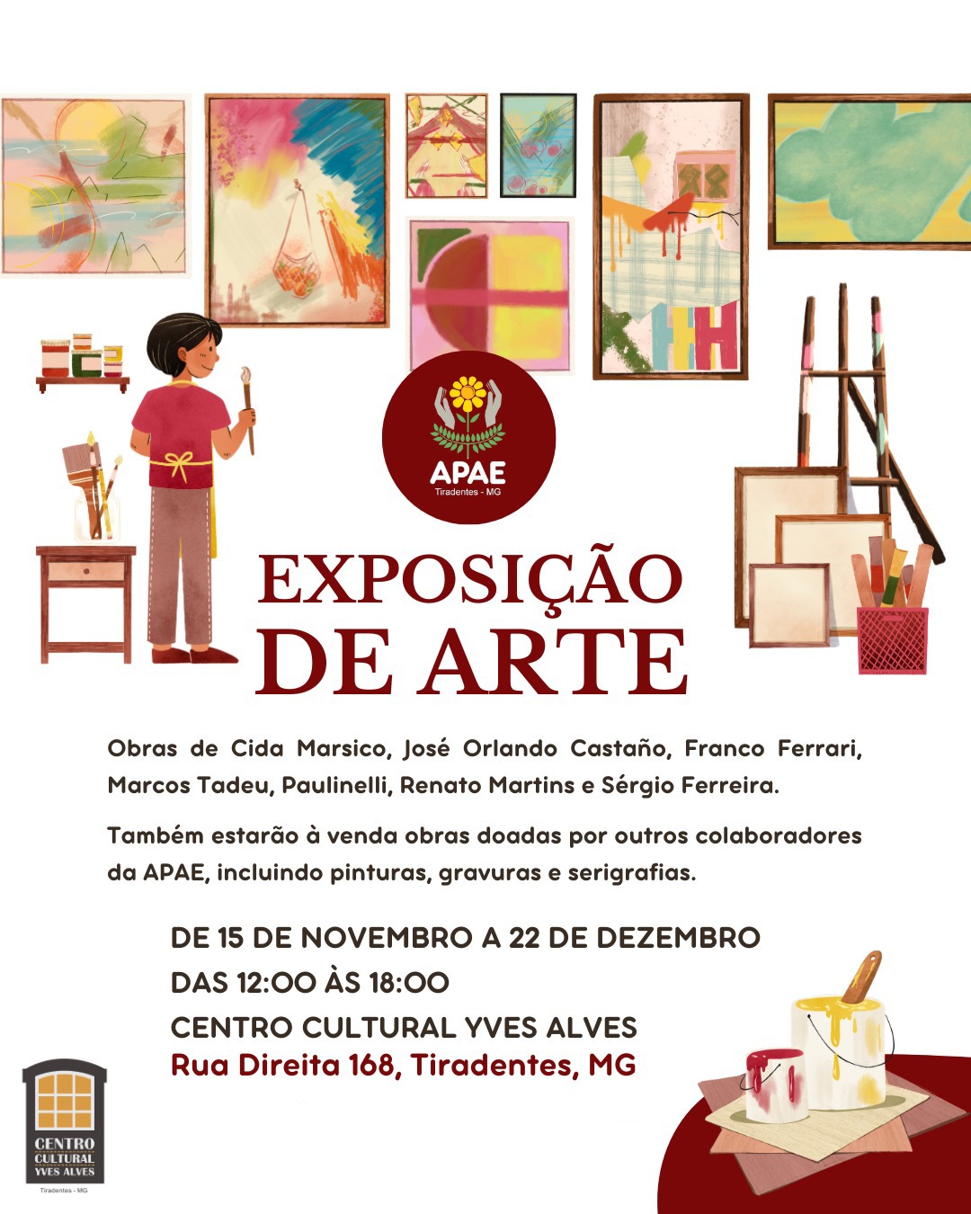 De 15 de novembro a 22 de dezembro, o Centro Cultural Yves Alves, em Tiradentes, receberá uma exposição beneficente com obras de renomados artistas mineiros. Doze telas de Cida Marsico, José Orlando Castaño, Franco Ferrari, Marcos Tadeu, Paulinelli, Renato Martins e Sérgio Ferreira, doadas pela Galeria Celma Albuquerque, estarão à venda, e toda a renda será destinada à APAE de Tiradentes. Além dessas, outras peças doadas, incluindo pinturas, gravuras e serigrafias, também estarão disponíveis, com preços bem abaixo do mercado.