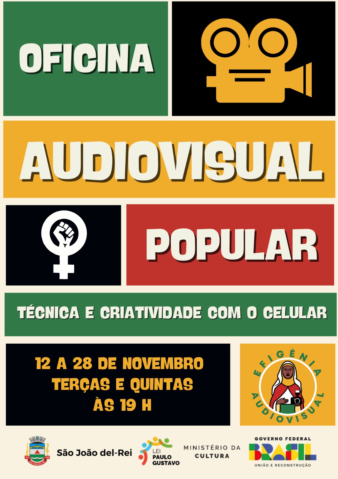 A Efigênia Audiovisual oferece a oficina Audiovisual Popular para jovens de 13 a 18 anos de São João del Rei, com foco no ensino das técnicas básicas da linguagem audiovisual e na criação artística por meio de exercícios práticos com o celular. A oficina acontece de 12 a 28 de novembro, às terças e quintas, das 19h às 21h, totalizando 16 horas de carga horária em 6 encontros, na sede da Efigênia Audiovisual, bairro São Dimas.