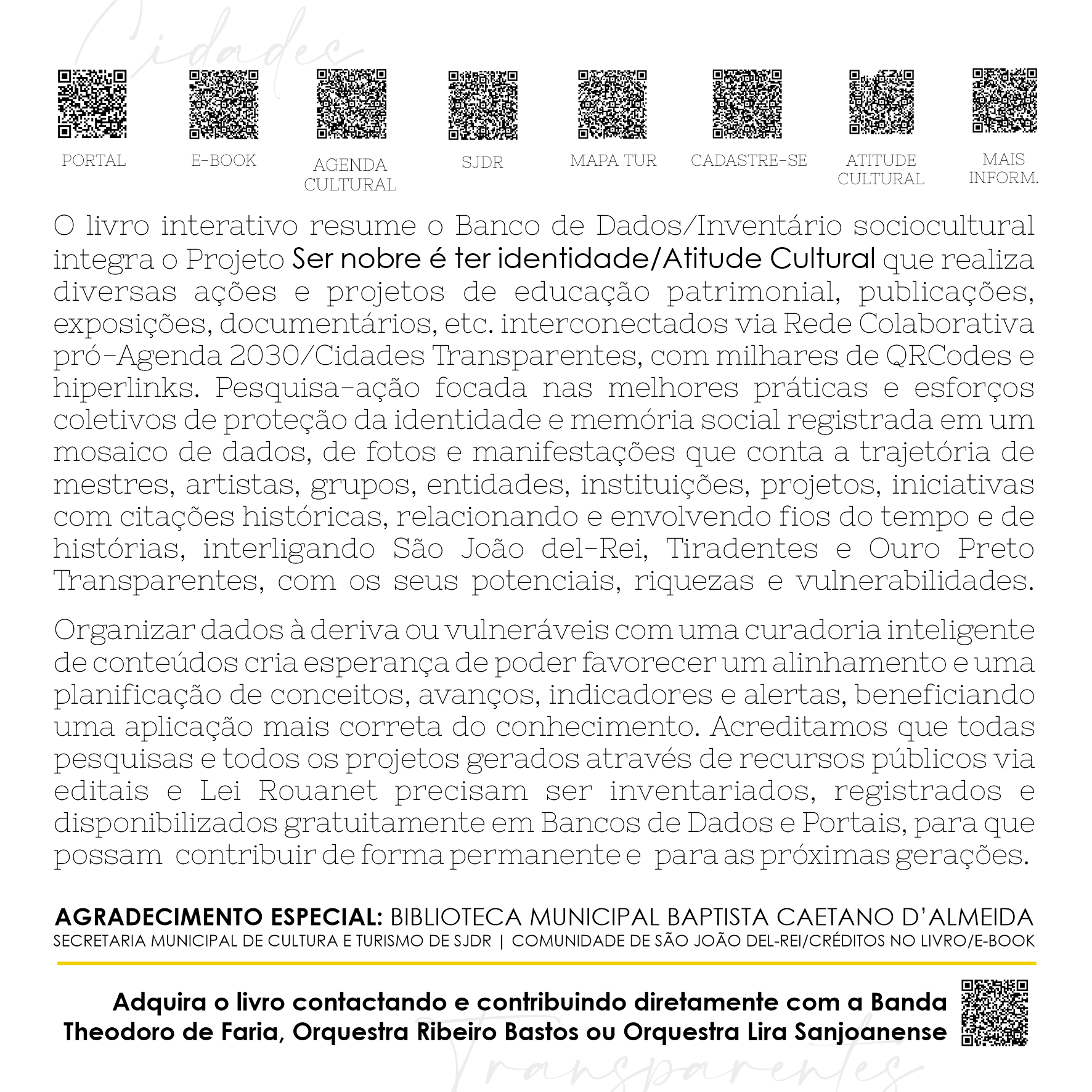 O livro resume o Banco de Dados/inventário sociocultural de São João del-Rei, agora em Rede Colaborativa através do Portal São João del-Rei, Tiradentes e Ouro Preto Transparentes. Construído voluntariamente desde o ano de 2000, este Banco de Dados incluiu a meta de envolver as três cidades irmãs que possuem riquezas e vulnerabilidades semelhantes, infância compartilhada na história, confidentes e revolucionárias nas decisões político-culturais do país, museus vivos orquestrados pela linguagem dos sinos e pela arte e música barroca, impecavelmente perpetuadas por suas irmandades e corporações - agora mais interconectadas. Podendo, cada vez mais e permanentemente, inventariar e interagir os nossos conteúdos e as nossas histórias.