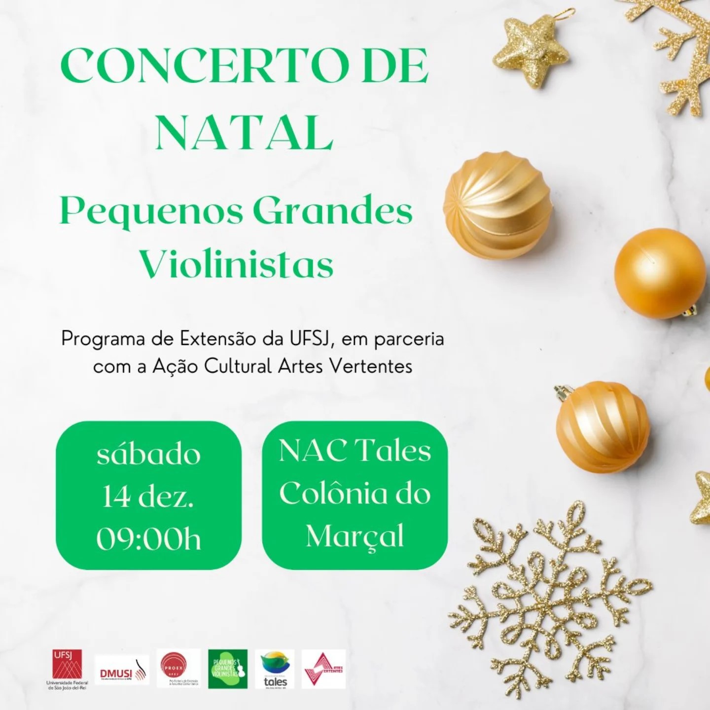 O programa de extensão Pequenos Grandes Violinistas, uma parceria entre a UFSJ e a Ação Cultural Artes Vertentes, realizará um concerto especial com músicas natalinas no próximo sábado, 16 de dezembro, às 9h, na sede da ONG NAC Tales, localizada na Colônia do Marçal, em São João del-Rei.