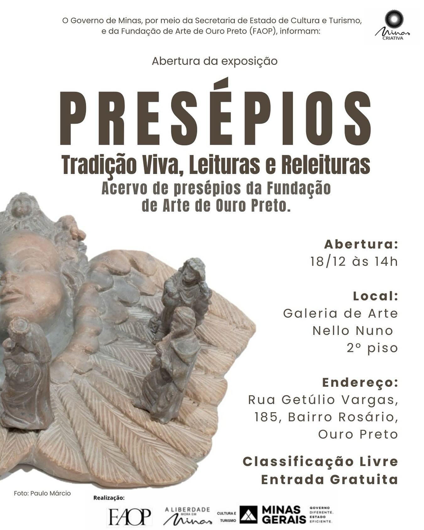 A partir de quarta feira, 18 de dezembro, estará aberta ao público a exposição "Presépios: Tradição Viva, Leituras e Releituras", que reúne mais de 70 obras no segundo piso da Galeria de Arte Nello Nuno, em Ouro Preto. O acervo inclui peças premiadas no Concurso Nacional de Presépios e doações de artistas, destacando a riqueza da tradição natalina e a diversidade cultural mineira.