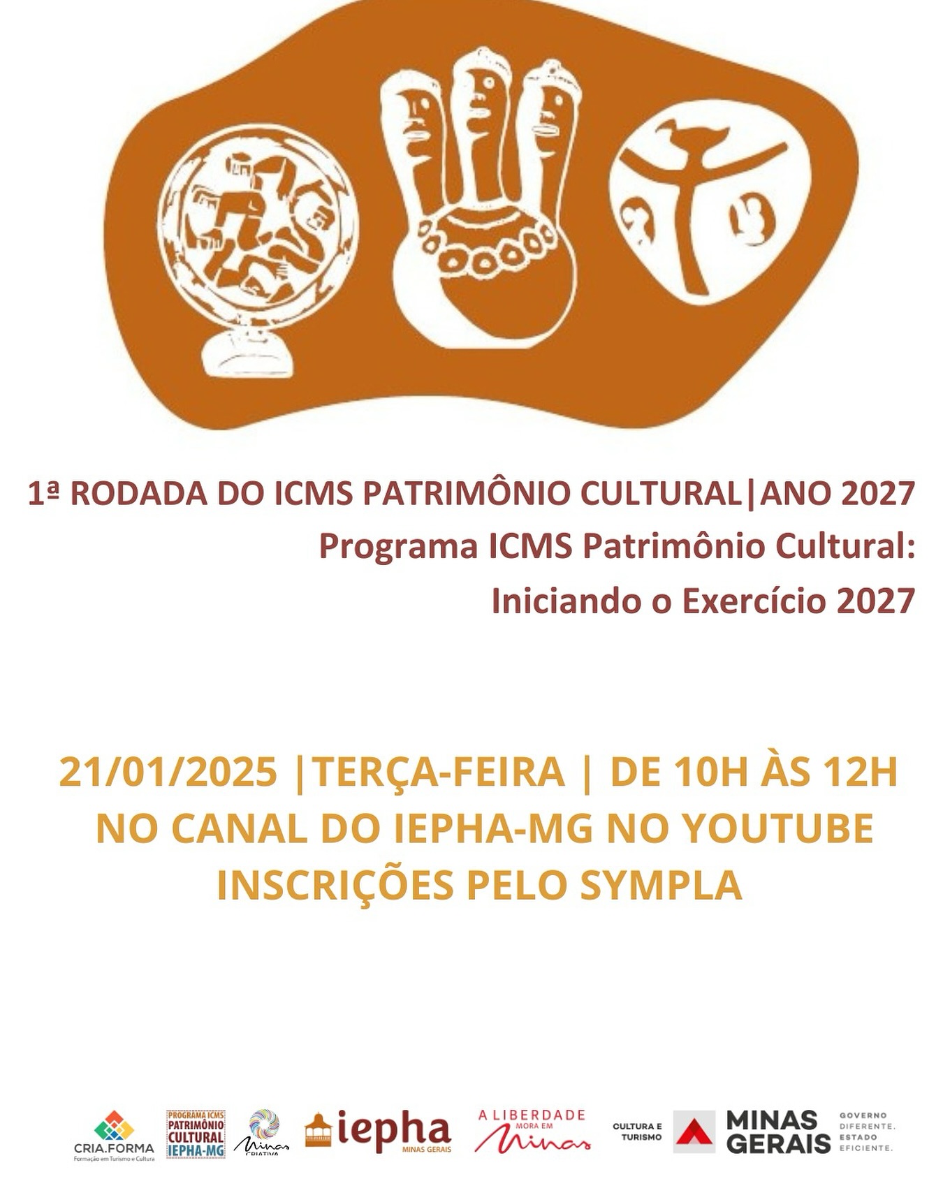 A Secretaria de Estado de Cultura e Turismo de Minas Gerais (SECULT-MG), por meio do IEPHA-MG, promove a 1ª Rodada do ICMS Patrimônio Cultural de 2025, com o tema "Iniciando o Exercício 2027". O evento será realizado no dia 21 de janeiro de 2025, das 10h às 12h, no canal oficial do IEPHA-MG no YouTube.
