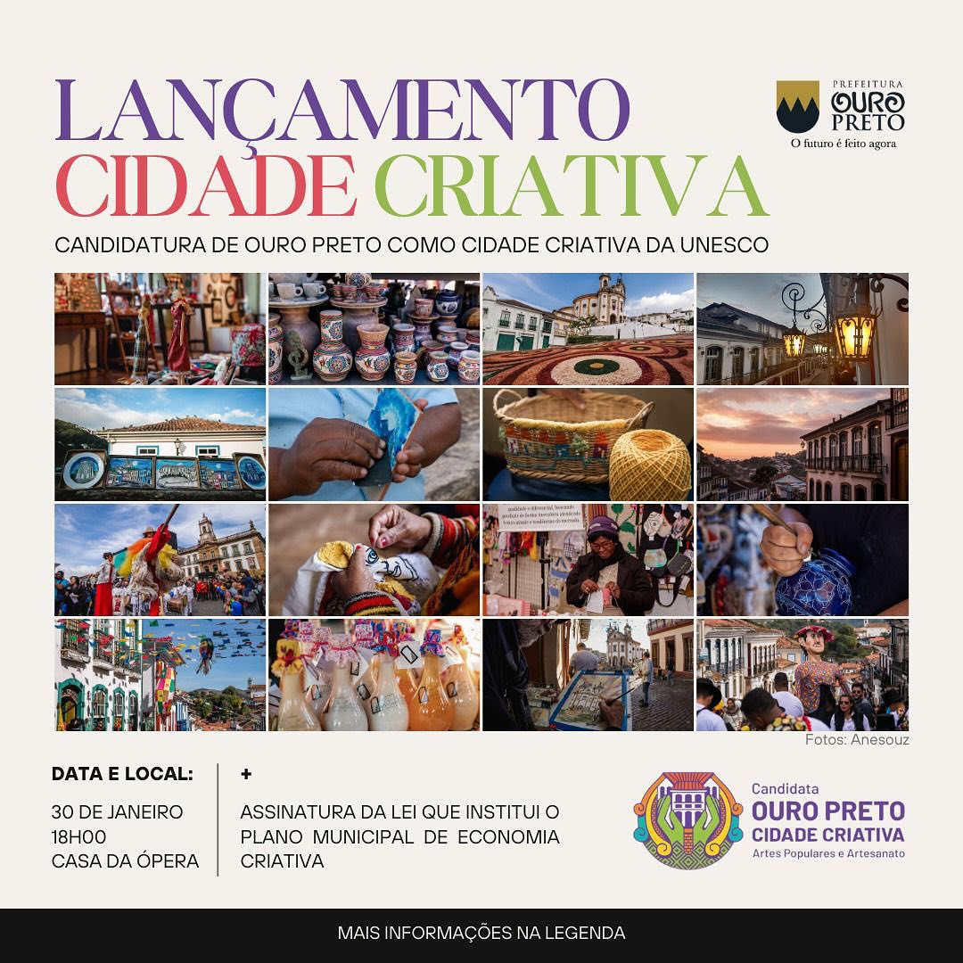 No dia 30 de janeiro, às 18h, na Casa da Ópera, Ouro Preto dá um passo importante em direção ao reconhecimento internacional com o lançamento oficial de sua candidatura a Cidade Criativa da UNESCO no campo das Artes Populares e Artesanato. O evento incluirá a assinatura do projeto de lei que institui o Plano Municipal de Economia Criativa, reforçando o compromisso da cidade com a cultura, o artesanato e a criatividade como vetores de desenvolvimento sustentável.