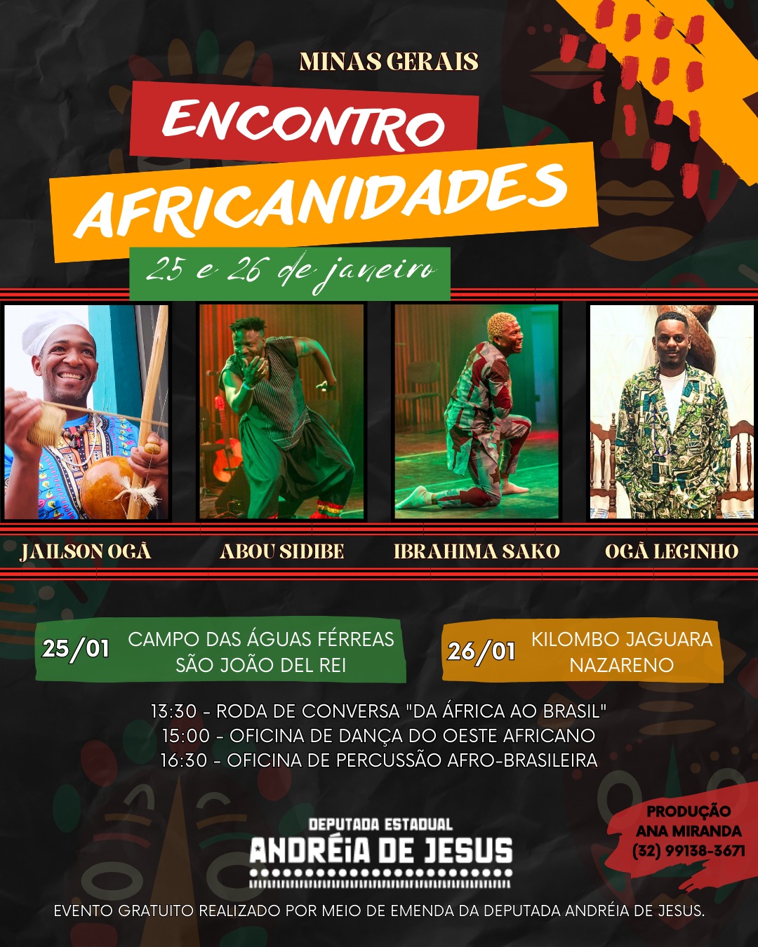 O Encontro Africanidades será realizado nos dias 25 e 26 de janeiro, a partir das 13h30, em dois locais: Águas Férreas, em São João del-Rei, e no Kilombo Jaguara, em Nazareno, ambos situados em Minas Gerais. O evento é gratuito e tem como objetivo promover um intercâmbio cultural por meio da dança e da percussão, conectando comunidades afro-brasileiras e artistas da Guiné (Conacri), localizada no oeste africano.