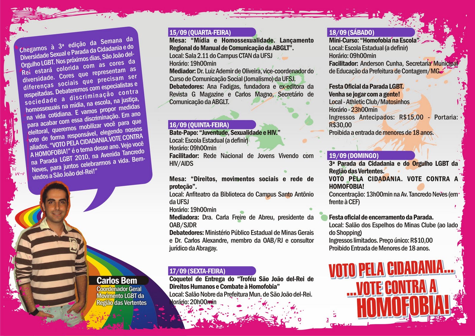 A Semana da Diversidade Sexual da Região das Vertentes acontece até o próximodomingo quando será encerrada com a 3ª Parada da Cidadania e do Orgulho LGBT da Região.Confira a programação completa no blog www.carllosbem.blogspot.com
