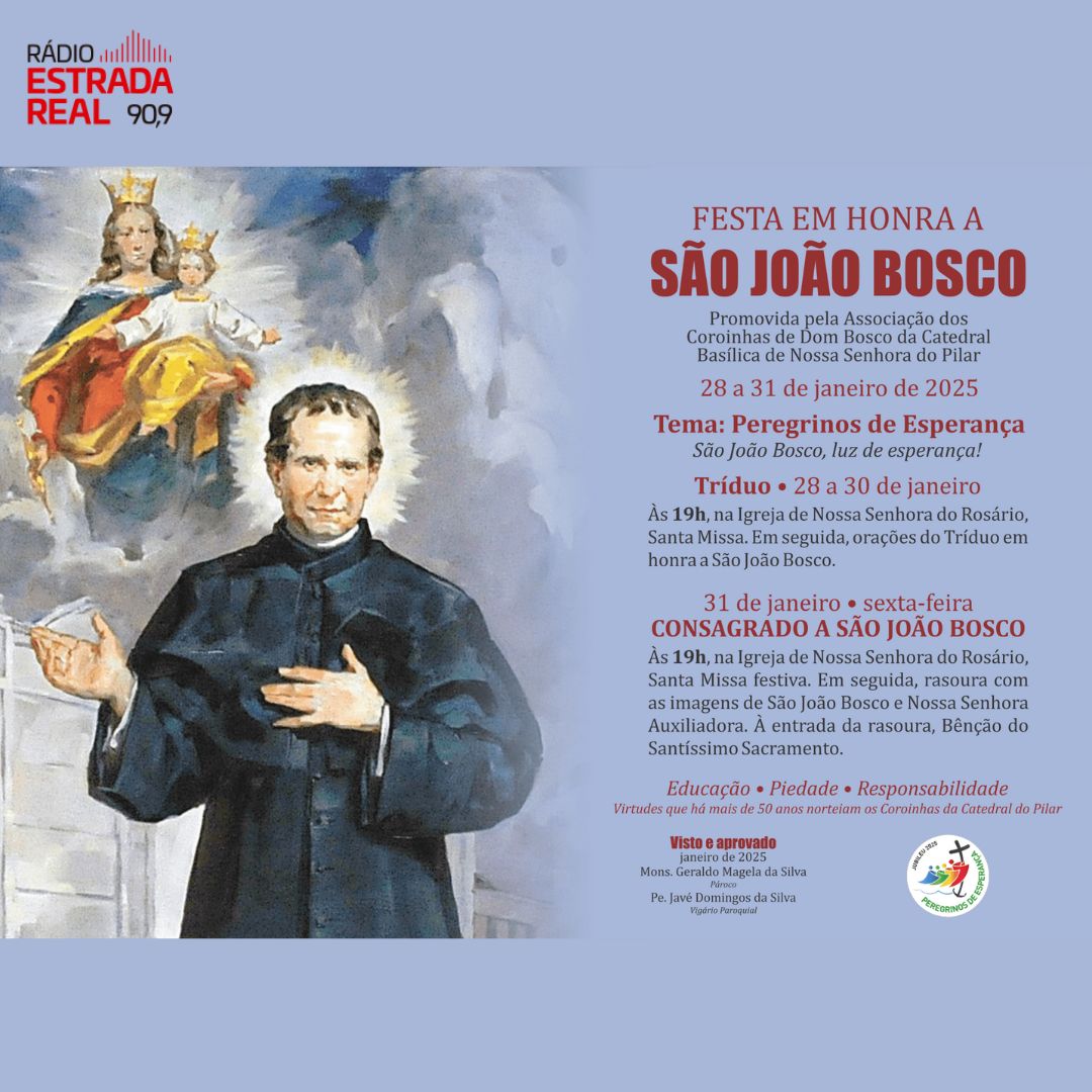A Associação dos Coroinhas de Dom Bosco promove, de 28 a 31 de janeiro, a Festa em Honra a São João Bosco, com o tema "Peregrinos de Esperança" – São João Bosco, luz de esperança!". O evento contará com momentos de oração e celebrações na Igreja de Nossa Senhora do Rosário.