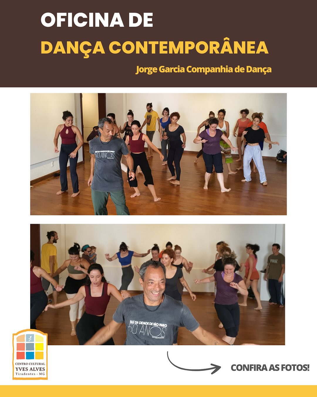 A Jorge Garcia Cia. de Dança realiza uma oficina de dança contemporânea no Centro Cultural Yves Alves, em 8 de fevereiro, conduzida pelo bailarino e coreógrafo Jorge Garcia. A atividade aborda técnicas corporais, noção de espaço, anatomia básica e expressão, proporcionando aos participantes um momento de experimentação e autoconhecimento. A oficina estimula a percepção corporal por meio de diferentes ritmos e dinâmicas de movimento.