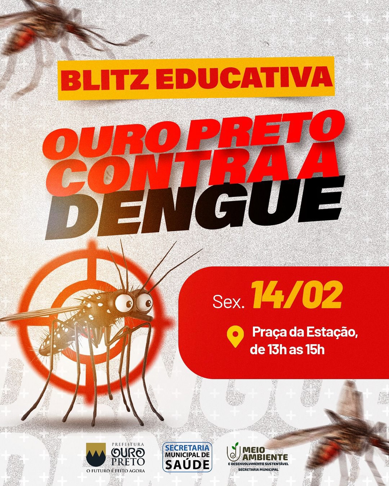 A Blitz Educativa: Ouro Preto Contra a Dengue será realizada na sexta-feira, 14 de fevereiro, das 13h às 15h, na Praça da Estação. A ação é promovida pela Prefeitura de Ouro Preto, por meio das Secretarias de Meio Ambiente, Saúde e Segurança e Trânsito, como parte da campanha "Todos Contra a Dengue", integrante do movimento Ouro Preto + Limpa. O objetivo é conscientizar a população sobre a importância da prevenção contra o mosquito Aedes aegypti e do descarte correto de resíduos.
