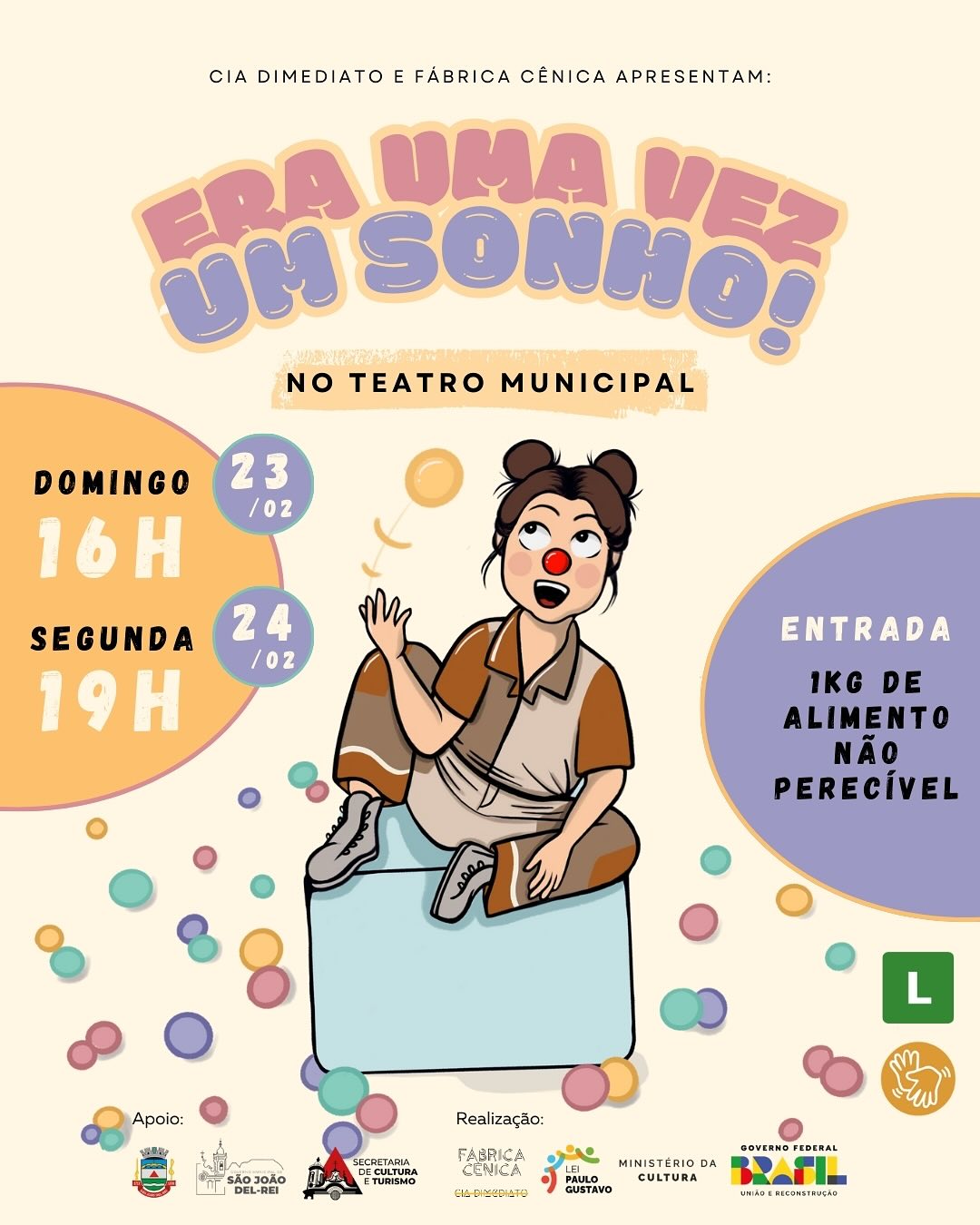 O espetáculo "Era uma vez um sonho", produzido pela CIA Dimediato e Fábrica Cênica, será apresentado no Teatro Municipal de São João del-Rei nos dias 23 e 24 de fevereiro, trazendo ao palco uma produção dedicada ao encantamento e à emoção do público. As sessões acontecem no dia 23/02, às 16h, e no dia 24/02, às 19h. A entrada será mediante a doação de 1 kg de alimento não perecível.