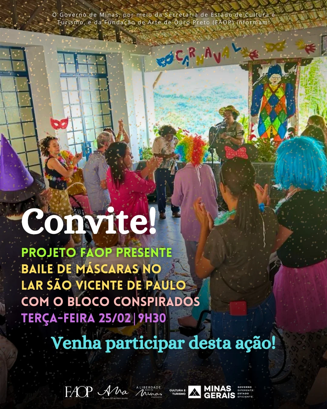 O projeto FAOP Presente promoverá o Baile de Máscaras no Lar São Vicente de Paulo, em Ouro Preto, com a participação do Bloco Conspirados. O evento contará com música, fantasias e confetes, proporcionando um momento de interação e alegria para os moradores da instituição. A atividade faz parte das ações socioculturais do projeto, que busca aproximar a comunidade por meio da arte e da cultura.
