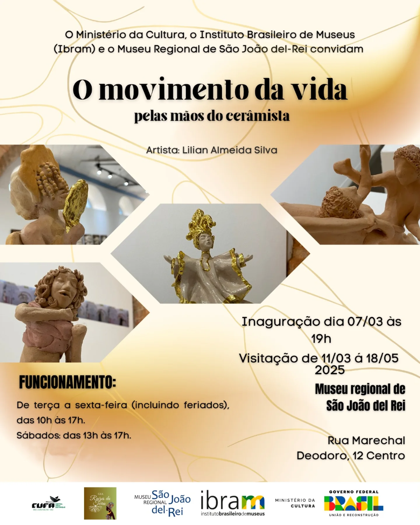 No dia 7 de março de 2025, às 19h, o Museu Regional de São João del-Rei inaugura duas exposições de arte, incluindo a mostra “O Movimento da Vida pela Mão da Ceramista”, que reúne sete peças em cerâmica de Lilian Almeida. As obras foram produzidas como parte do Trabalho de Conclusão de Curso em Artes Aplicadas da Universidade Federal de São João del-Rei e exploram referências da cultura afro-brasileira presentes no Bairro São Geraldo.