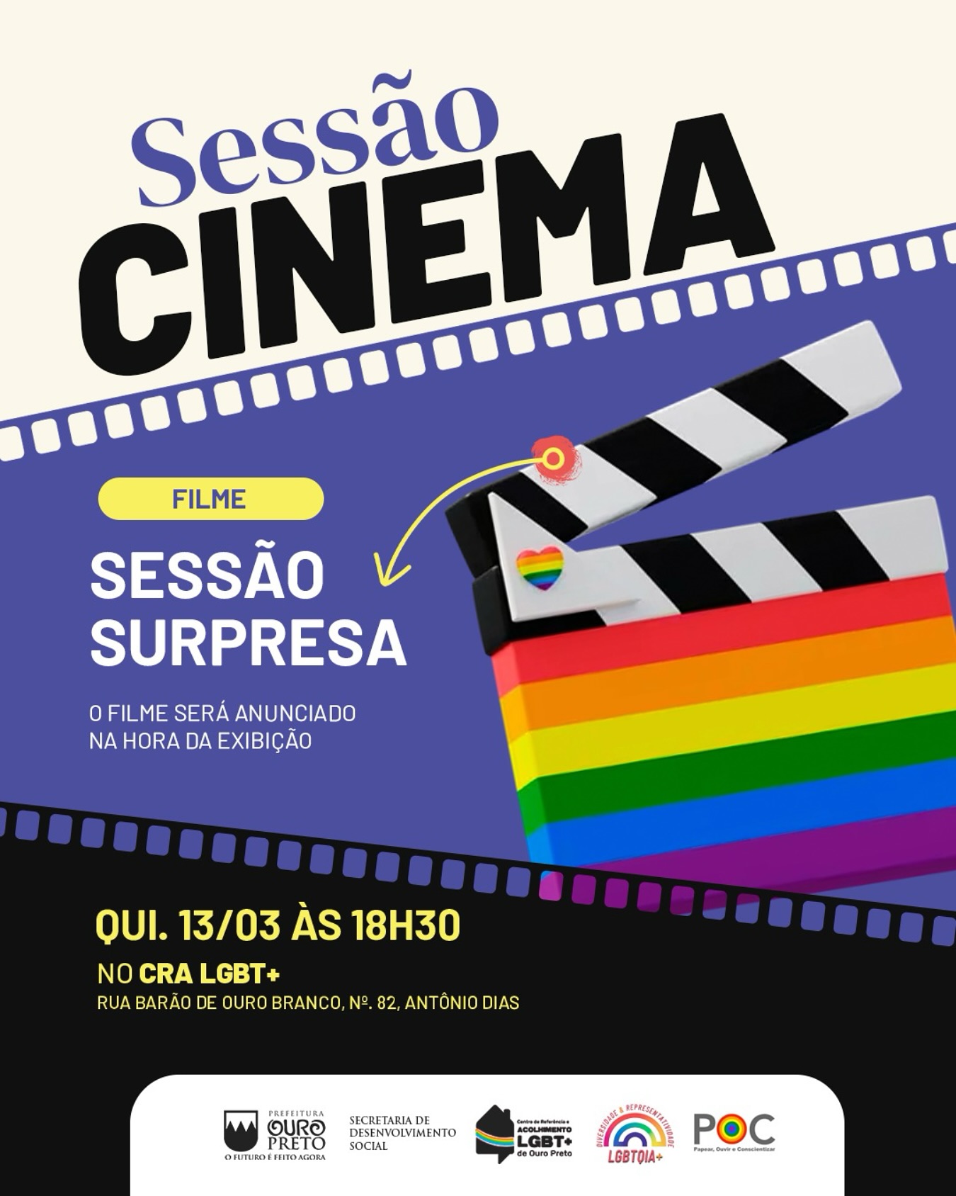 O Cine LGBT+ realiza mais uma sessão no Centro de Referência e Acolhimento (CRA) LGBT+ em Ouro Preto. O evento acontece na quinta-feira, 13 de abril, às 18h30, com exibição de um filme surpresa, seguida de um debate sobre temas relacionados à vivência da população LGBT+.