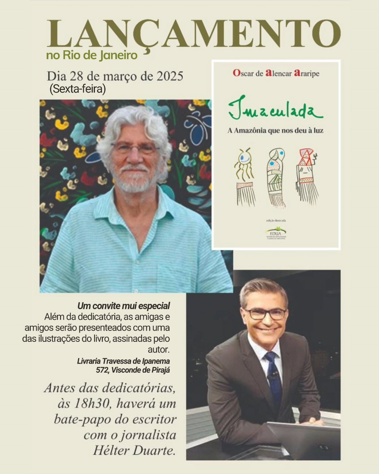 O escritor e pintor brasileiro Oscar Araripe lança seu novo livro, "Imaculada: A Amazônia que nos deu a luz", no dia 28 de março, na Livraria da Travessa Ipanema, localizada na Rua Visconde de Pirajá, 572, Rio de Janeiro. Durante o evento, o autor fará a dedicatória e presenteará os leitores com uma ilustração do livro assinada por ele.