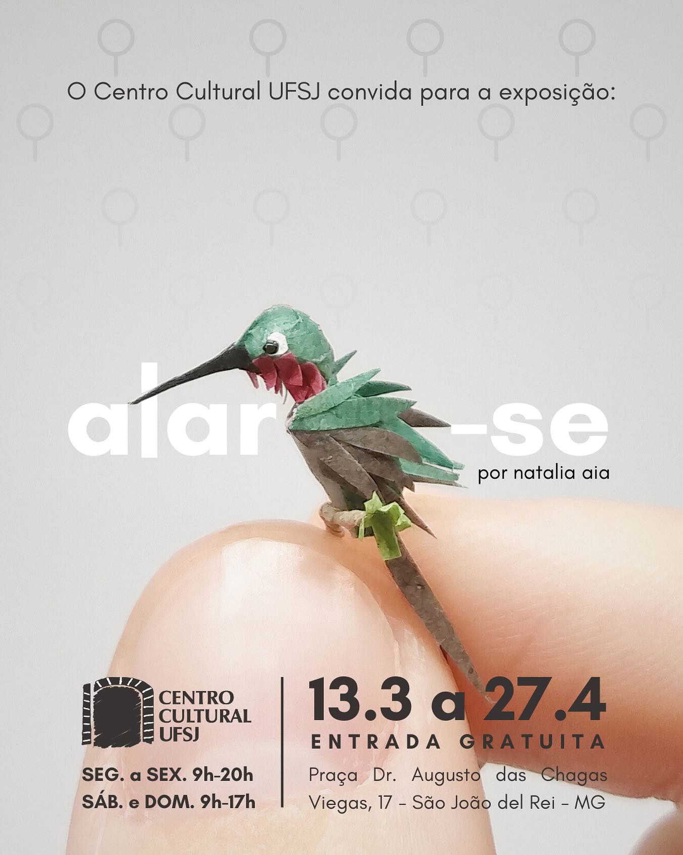 A artista visual e bióloga Natália Aia apresenta sua exposição "Alar-se" no dia 13 de março a partir das 9h, no Centro Cultural da UFSJ. A exposição exibe mini esculturas de papel que expressam a natureza como manifestação do sublime. A mostra convida o público a uma reflexão sobre o reencontro com suas próprias asas, evocando a conexão entre arte e o mundo natural.
