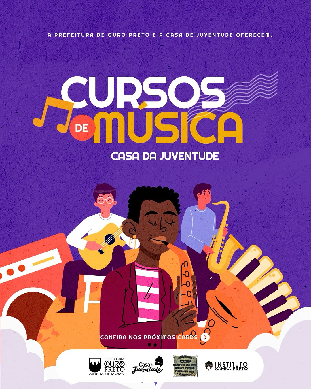 A Casa da Juventude oferece mais de 130 vagas para aulas de formação musical destinadas a jovens a partir de 12 anos. As atividades ocorrem em quatro polos: Casa da Juventude de Ouro Preto (Bauxita), Casa da Juventude de Cachoeira do Campo, Casa de Cultura da Piedade e Instituto Samba Preto. A programação inclui Educação Artística, Flauta Doce, Jogos Musicais, Grupo de Tambor, Canto, Violão, Teclado e Musicalização Infantil, com 19 horários disponíveis de segunda a sexta-feira.