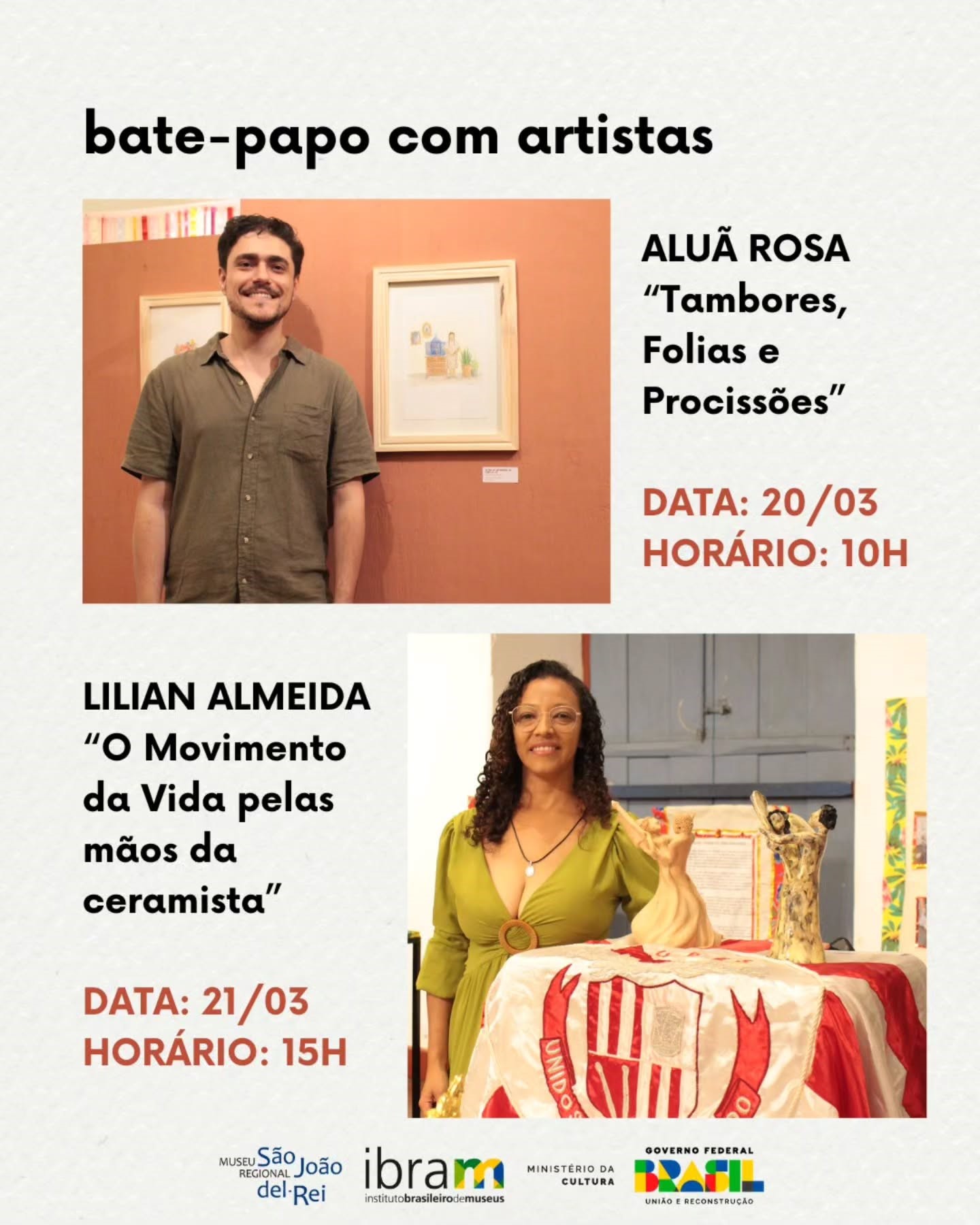 O bate-papo com artistas acontece nos dias 20 e 21 de março no Museu Regional de São João del-Rei, com discussões sobre exposições em andamento. No dia 20 de março, às 10h, o artista Aluã Rosa apresenta a exposição "Tambores, Folias e Procissões". No dia 21 de março, às 15h, a ceramista Lilian Almeida compartilha detalhes sobre a mostra "O Movimento da Vida pelas Mãos da Ceramista".