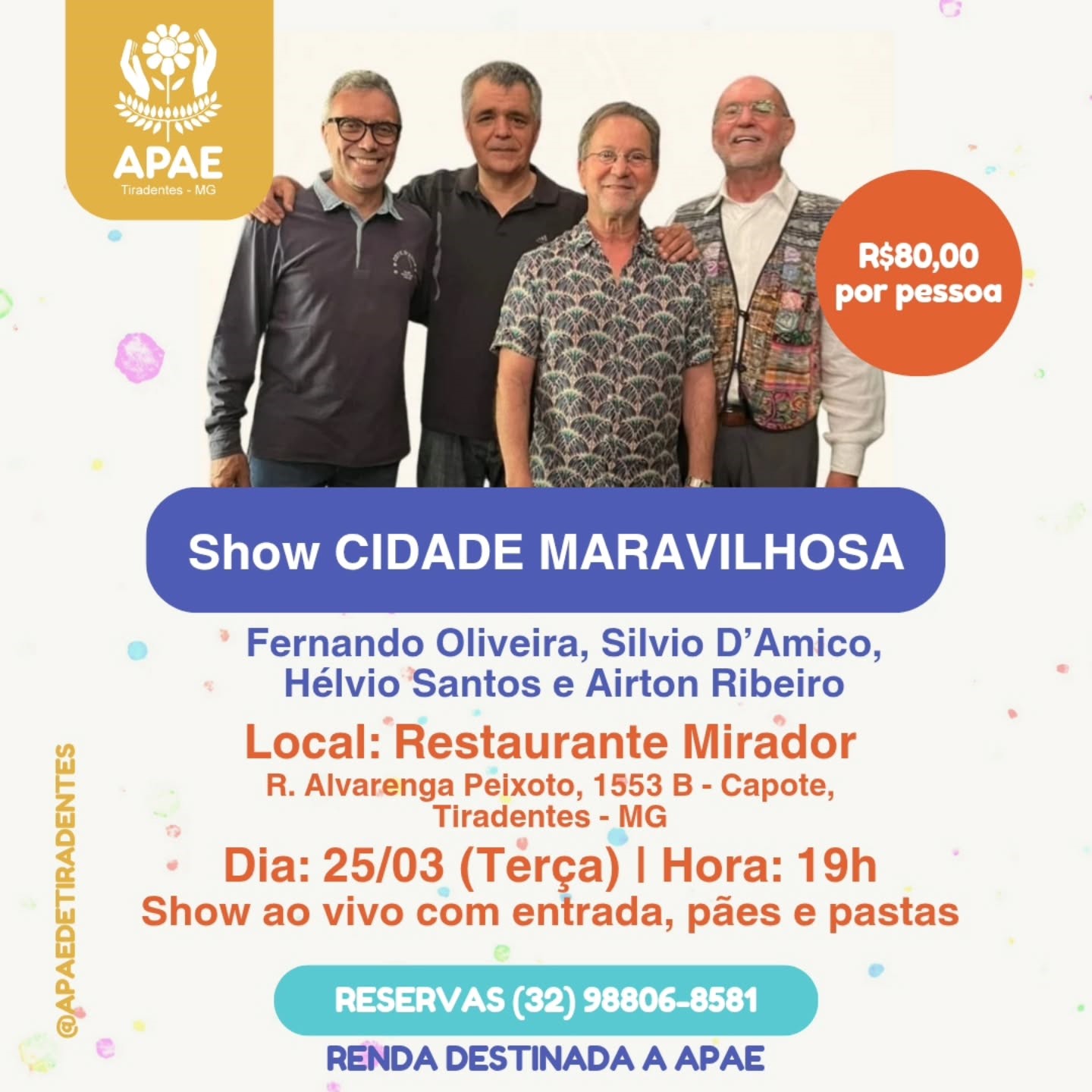 O Show Cidade Maravilhosa será realizado no dia 25 de março, às 19h, no Restaurante Mirador (Rua Alvarenga Peixoto, 1553 B - Capote, Tiradentes - MG). O evento contará com apresentações ao vivo de Fernando Oliveira, Silvio D’Amico, Helvio Santos e Airton Ribeiro, oferecendo uma experiência musical acompanhada de entrada, pães e pastas. O valor do ingresso é R$ 80,00. As reservas podem ser feitas através do contato (32) 98806-8581