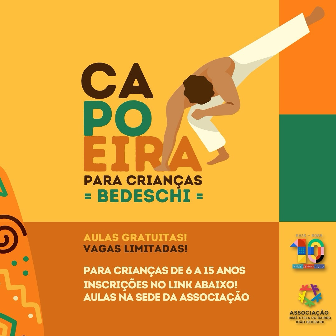 A Associação Irmã Stela do Bairro João Bedeschi oferece aulas gratuitas de Capoeira para crianças de 6 a 15 anos, promovendo cultura, música e desenvolvimento físico. As atividades acontecem na sede da associação, com vagas limitadas para garantir um aprendizado de qualidade.