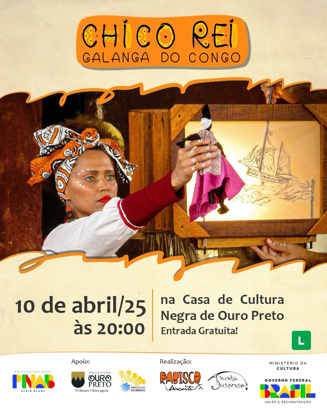 O espetáculo teatral "Chico Rei: Galanga do Congo" será apresentado no dia 10 de abril de 2025 (quinta-feira), às 20h, na Casa da Cultura Negra de Ouro Preto, localizada na Rua Padre Faria, 14, ao lado da Igreja Matriz de Santa Efigênia, em Ouro Preto (MG). A entrada é gratuita, com retirada de ingressos a partir das 19h30, limitada à lotação do espaço.