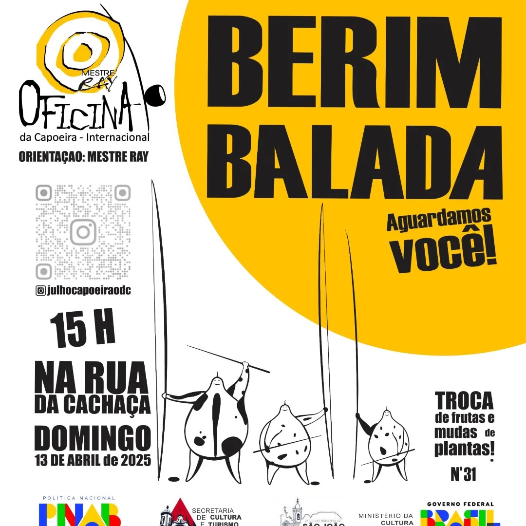 A Berimbalada, oficina de capoeira, ocorre no domingo, 13 de abril, com programação aberta ao público na tradicional Rua da Cachaça, em São João del-Rei. O encontro, realizado com o apoio da Lei Aldir Blanc, promove a Oficina de Capoeira Internacional com orientação de Mestre Ray, além de trocas de mudas de plantas e frutas, criando um espaço coletivo voltado à convivência, aprendizado e valorização da cultura da capoeira. A atividade é gratuita e aberta a todas as idades.