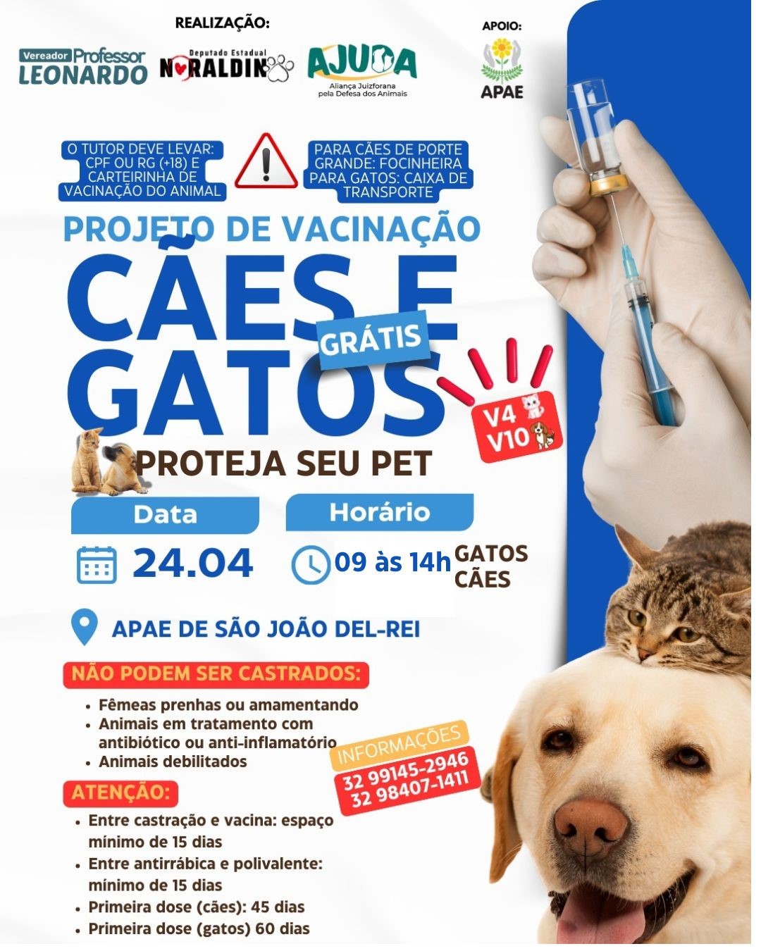 O projeto "Proteja Seu Pet", com apoio da APAE de São João del-Rei, promove uma ação gratuita de vacinação para cães e gatos no dia 24 de abril, das 9h às 14h, na sede da APAE de São João del-Rei. A campanha é destinada a tutores que desejam proteger seus animais por meio da imunização, respeitando os critérios técnicos e de saúde exigidos para cada espécie.