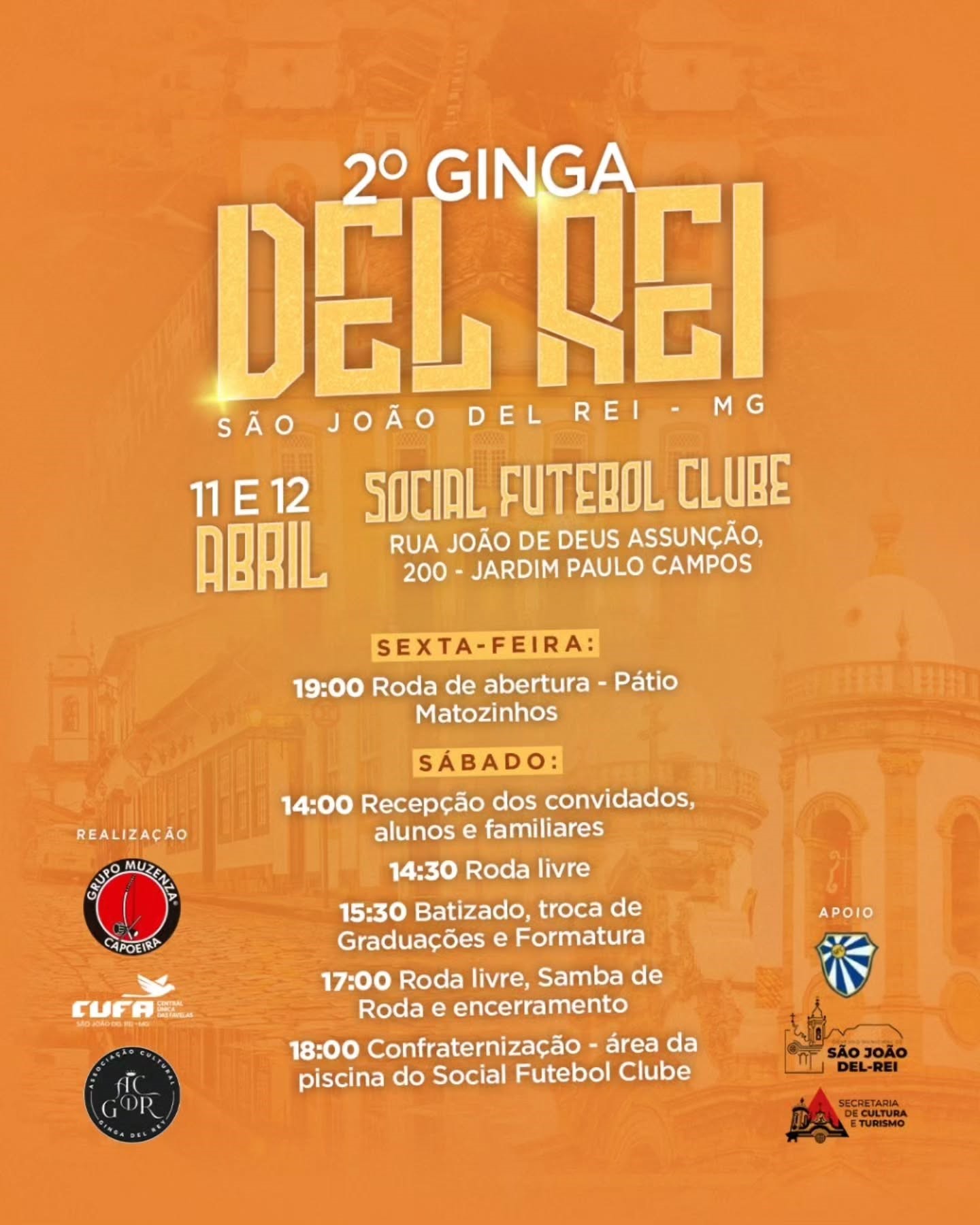 O Grupo de Capoeira Muzenza promove a 2ª Ginga Del Rei, evento dedicado à valorização da capoeira em São João del-Rei. A programação acontece nos dias 11 e 12 de abril de 2024, com atividades abertas ao público em diferentes locais da cidade. O encontro reúne alunos, familiares e convidados para rodas, batizados e momentos de confraternização.