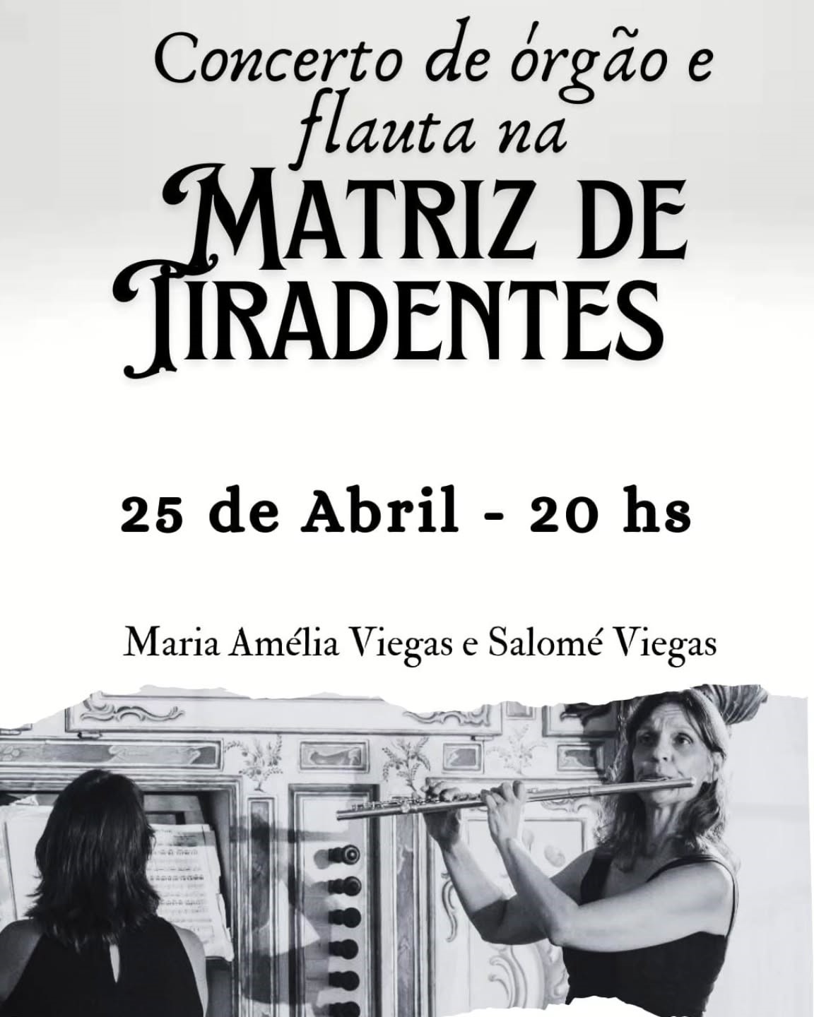 O Concerto de Órgão e Flauta na Matriz em Tiradentes acontece na sexta-feira, 25 de abril de 2025, às 20h, na Igreja Matriz de Santo Antônio, em Tiradentes (MG). A apresentação reunirá a organista Maria Amélia Viegas e a flautista Salomé Viegas em um programa que percorre séculos de tradição musical, valorizando a sonoridade do órgão histórico em diálogo com a flauta.