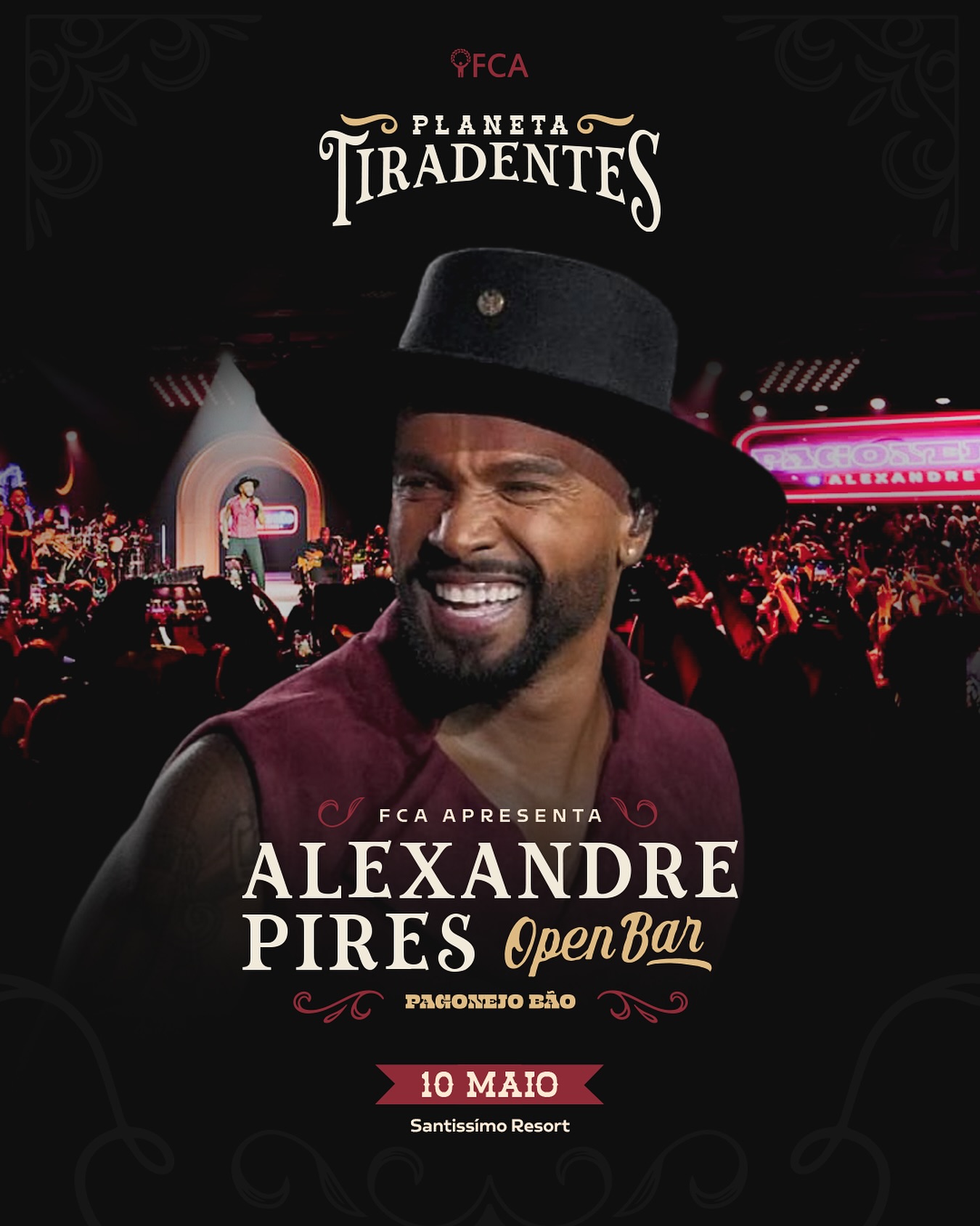 O evento Planeta Tiradentes – Alexandre Pires com o Pagonejo Bão será realizado no dia 10 de maio de 2025 no Santíssimo Resort, com abertura dos portões às 16h, em Tiradentes (MG). A atração principal da noite será o cantor Alexandre Pires, que apresenta o projeto Pagonejo Bão, um espetáculo que une sucessos do pagode e do sertanejo em um único show. Os ingressos estão disponíveis para compra online e as últimas edições do evento registraram lotação máxima.