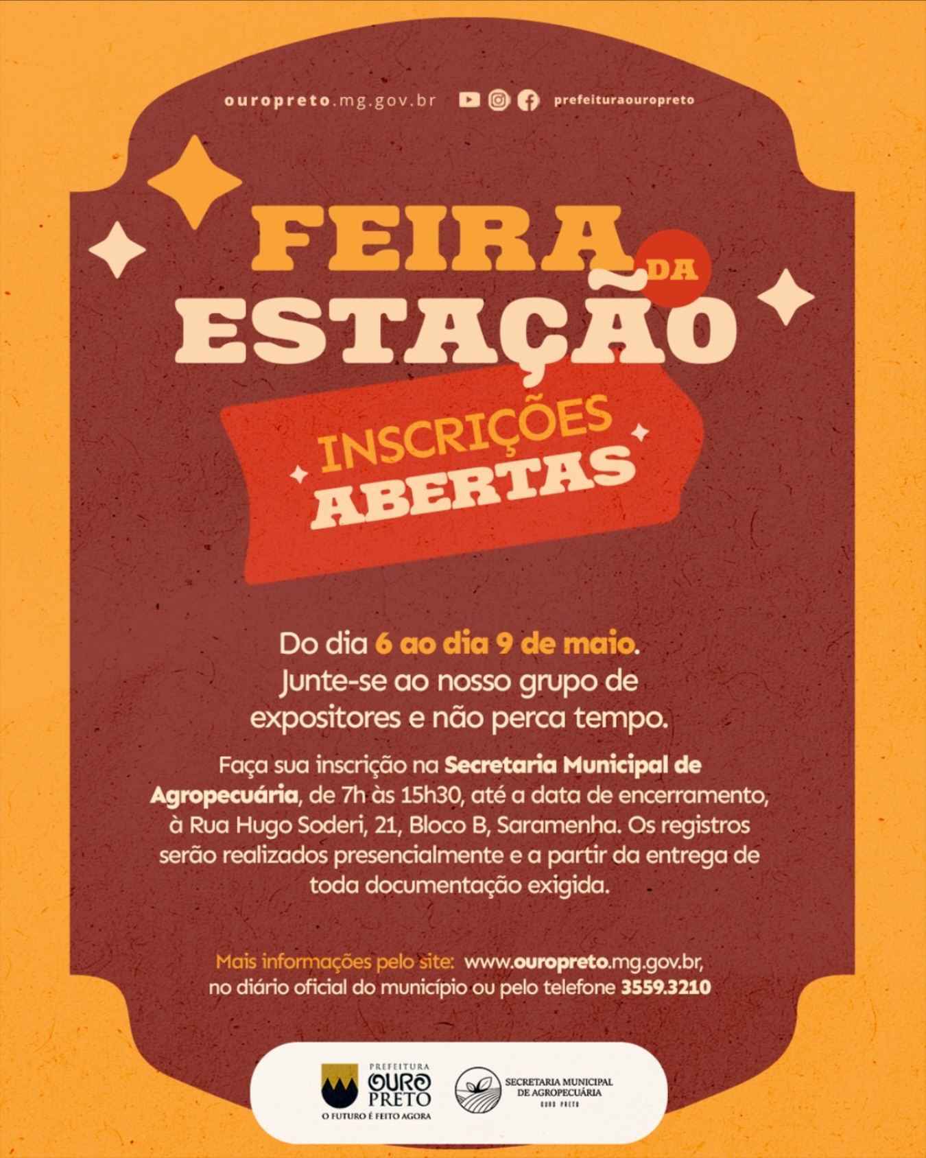 Estão abertas as inscrições para a Feira Noturna de Ouro Preto – Feira da Estação, que acontecerá em Ouro Preto (MG). Os interessados em participar como expositores devem se inscrever entre os dias 6 e 9 de maio de 2025, comparecendo pessoalmente à Secretaria Municipal de Agropecuária, localizada à Rua Hugo Soderi, 21, Bloco B, bairro Saramenha, no horário de 7h às 15h30.