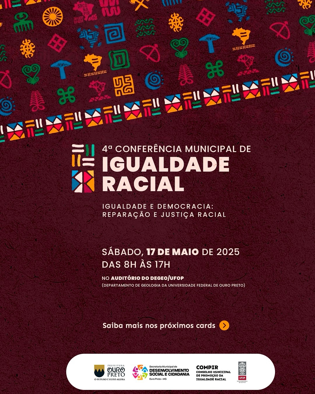 A 4ª Conferência Municipal de Igualdade Racial será realizada no sábado, 17 de maio de 2025, no Departamento de Geologia da Universidade Federal de Ouro Preto (DEGEO), das 8h às 17h. O evento é promovido pela Prefeitura de Ouro Preto, em parceria com o Conselho Municipal de Promoção da Igualdade Racial (COMPIR) e a Secretaria de Desenvolvimento Social (SMDS). A conferência faz parte das ações dos 100 dias de governo, com foco na pauta racial e na ampliação de políticas públicas voltadas à equidade racial.