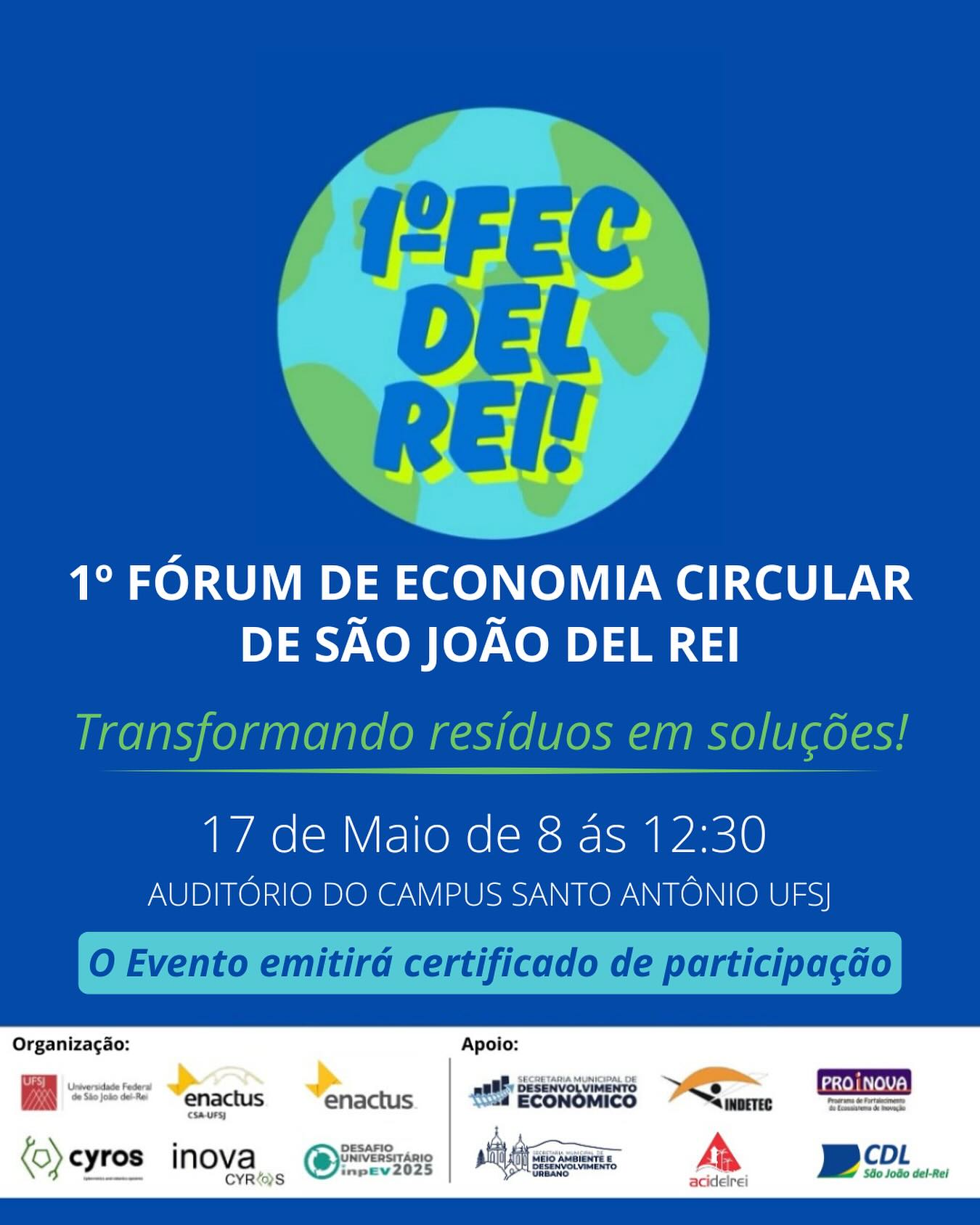 O 1º Fórum de Economia Circular de São João del-Rei será realizado no dia 17 de maio de 2025, das 8h às 12h30, no auditório do Campus Santo Antônio da UFSJ. O evento é gratuito, aberto ao público e organizado pelo Time Enactus UFSJ – Campus Santo Antônio, como parte do Desafio Universitário InpEV 2025, iniciativa nacional voltada à educação ambiental e sustentabilidade com base nos Objetivos de Desenvolvimento Sustentável (ODS) da ONU.