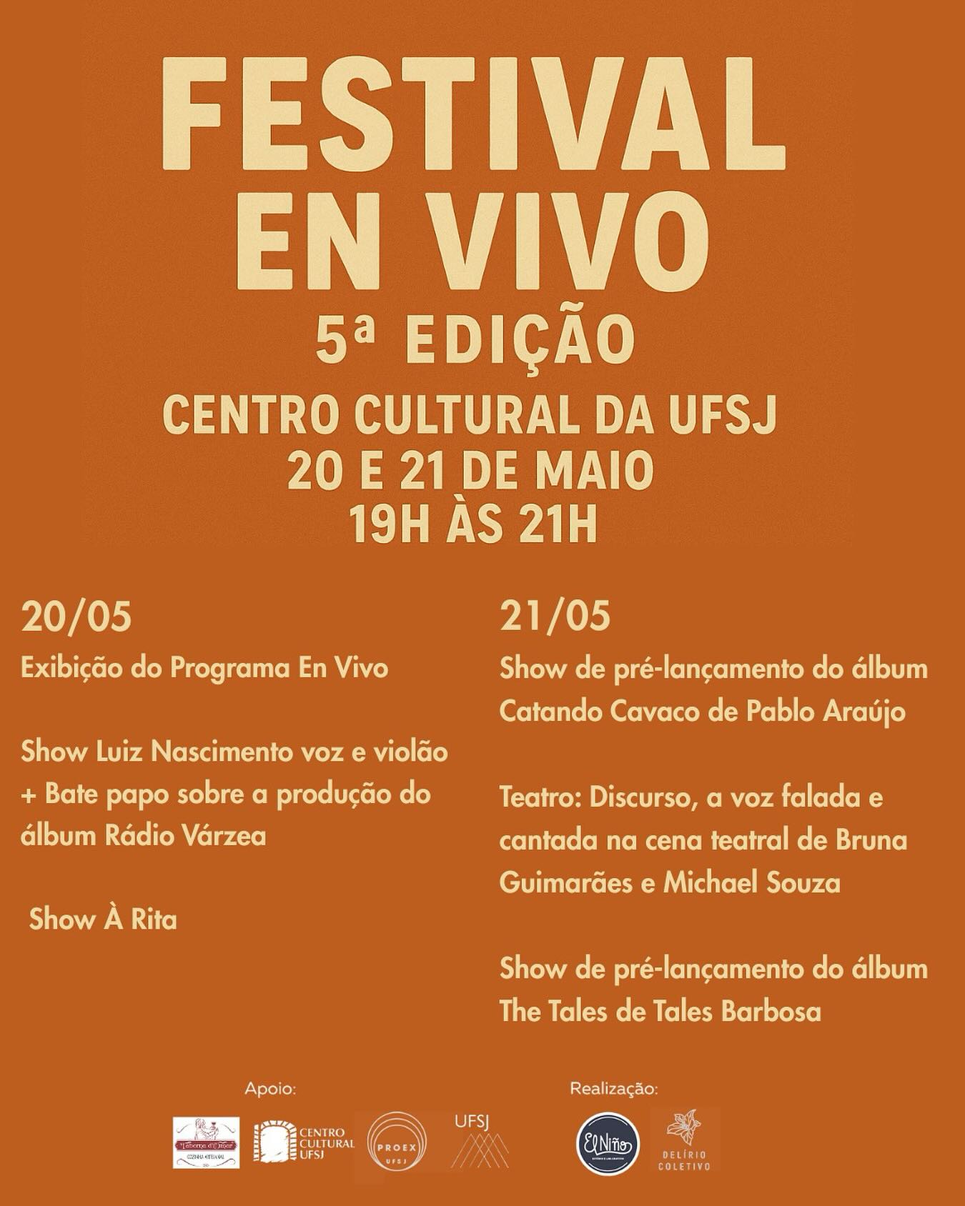 O 5º Festival En Vivo será realizado nos dias 20 e 21 de maio de 2025, no Centro Cultural da UFSJ, em São João del-Rei/MG, com entrada gratuita. Idealizado por Leonardo Avellar Vieira e realizado pelo El Niño – Estúdio e Lab. Criativo, em parceria com o coletivo Delírio Coletivo, o evento reúne música ao vivo, exibições audiovisuais e teatro, destacando a diversidade da cena artística da região.
