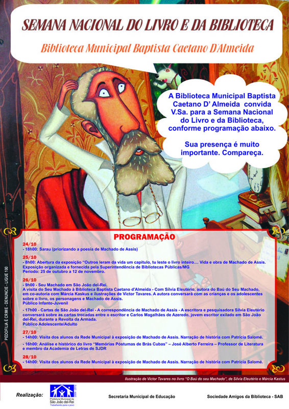 - Seu Machado vem a São João del Rei e visita a Biblioteca Municipal.Com Sílvia Eleutério - autora do livro O baú do Seu Machado com co-autoria de Márcia Kaskus e ilustração de Victor Tavares.